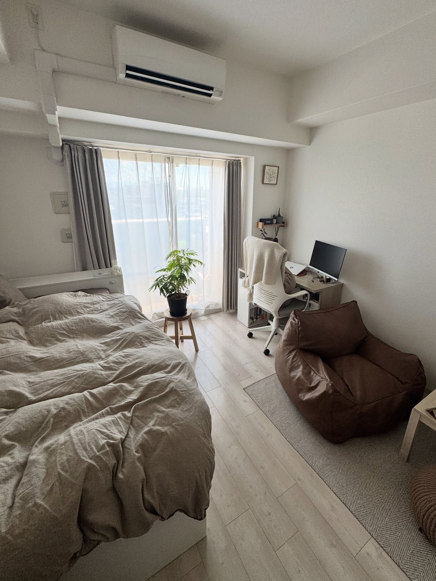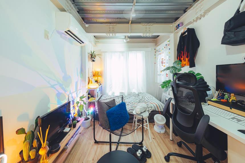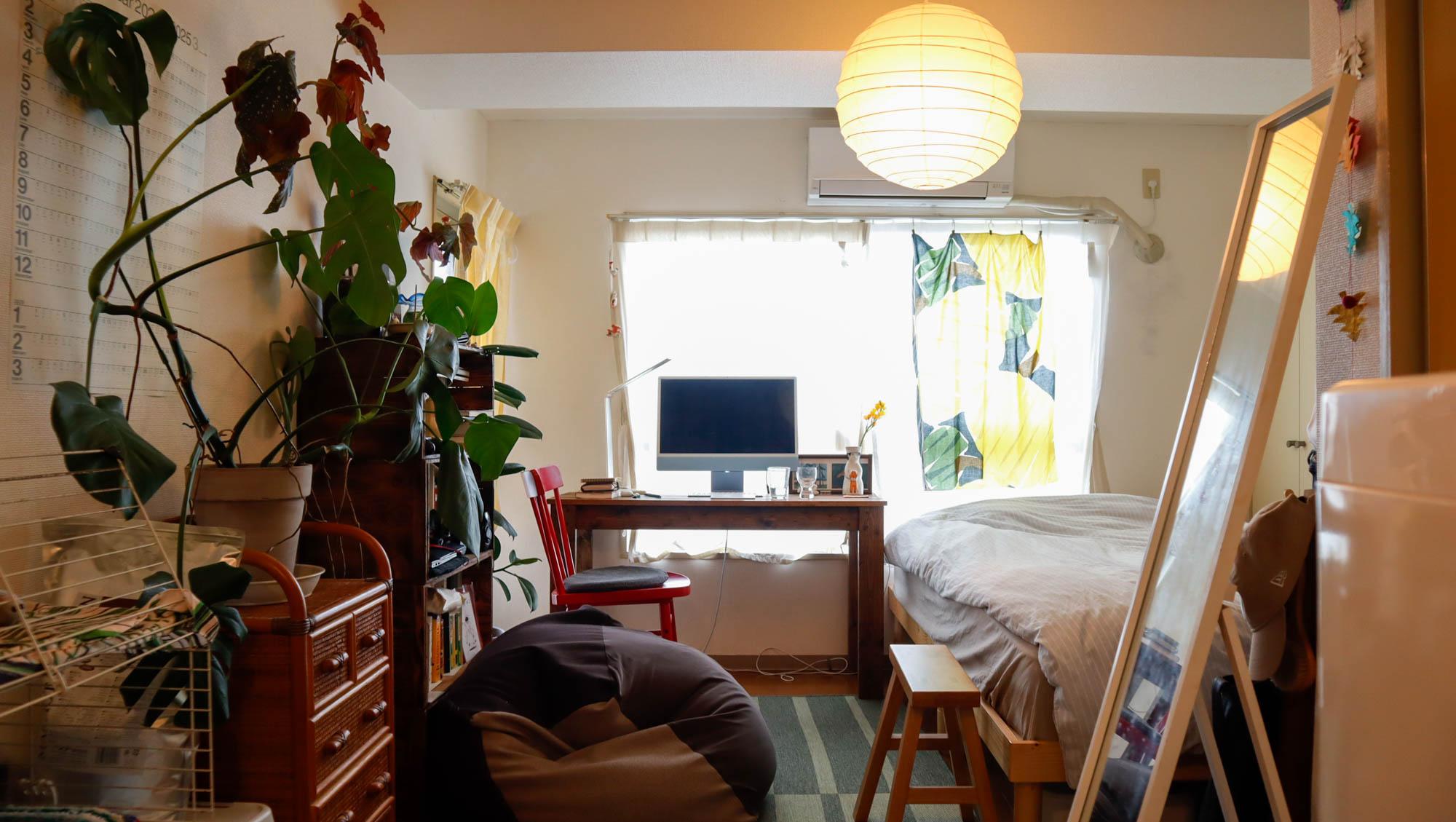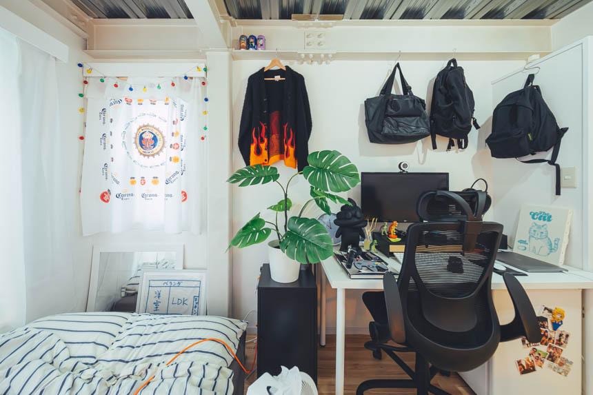 Trong căn hộ 20m², bàn làm việc được đặt làm theo kích thước riêng trên Creema*, quay thẳng ra cửa sổ. (*Creema: nền tảng thương mại điện tử của Nhật Bản, chuyên bán sản phẩm thủ công và đồ đặt làm theo yêu cầu).