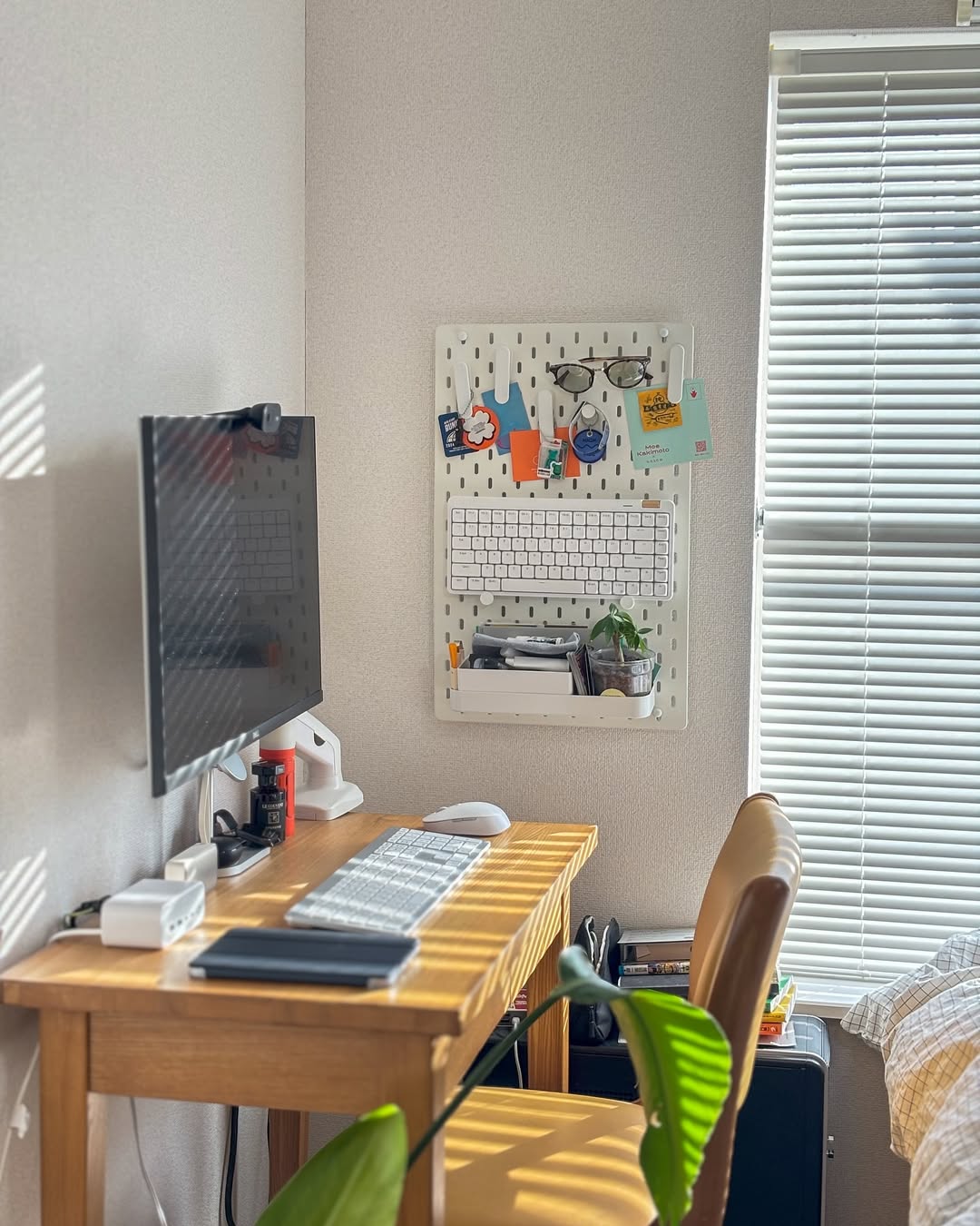 • Bên cạnh bàn là bảng pegboard SKÅDIS của IKEA, nơi bạn có thể treo dụng cụ, phụ kiện hoặc đồ trang trí để thêm điểm nhấn.