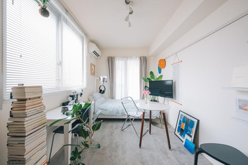 Trong căn phòng vuông khoảng 11m² (7 chiếu tatami*), bàn được đặt sát cửa sổ và song song với kệ TV.