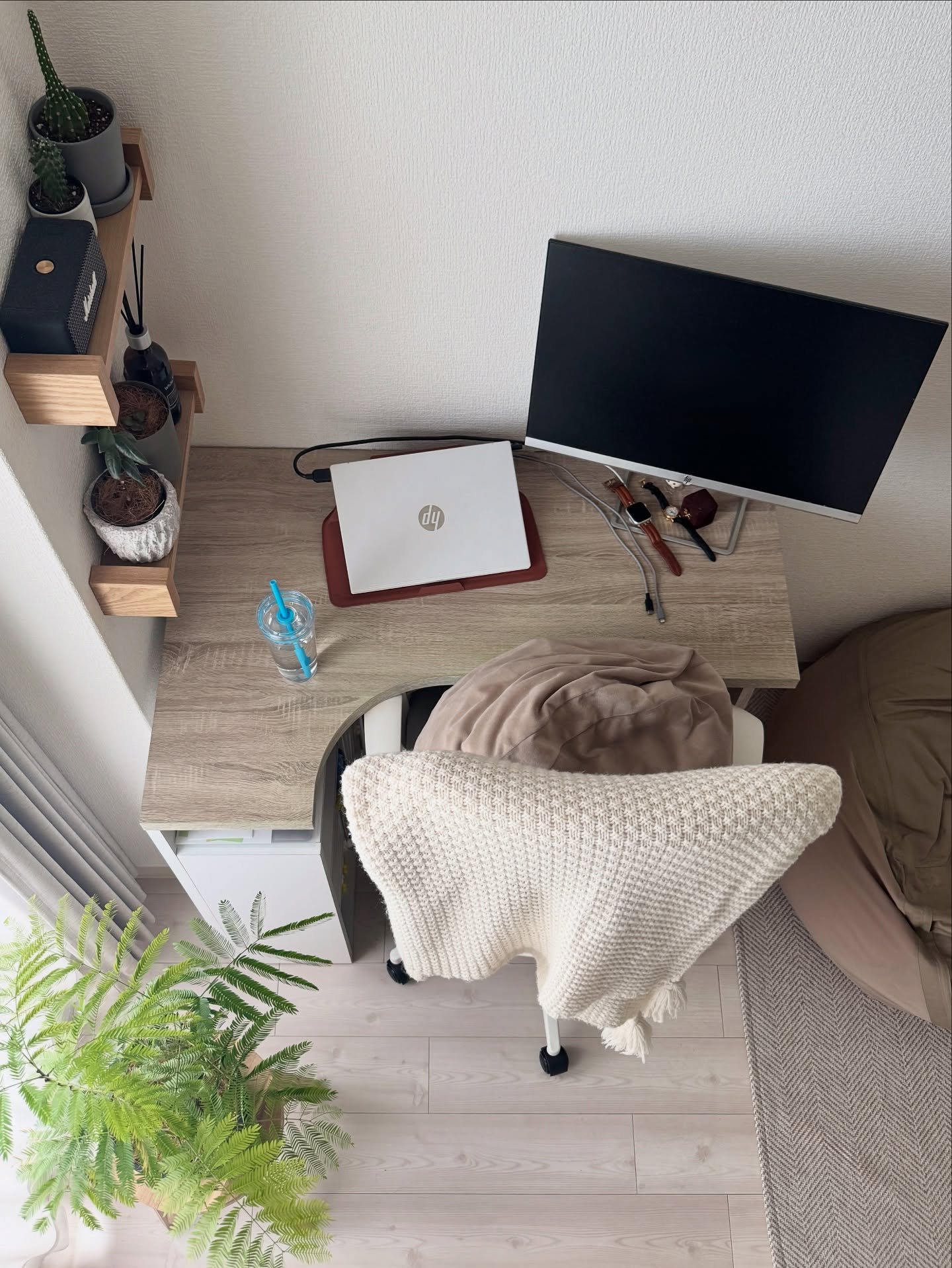 Bàn chữ L đặt ở góc căn hộ 13m2 với kệ tường phía trên giúp tiết kiệm diện tích và tạo cảm giác rộng, liền mạch.