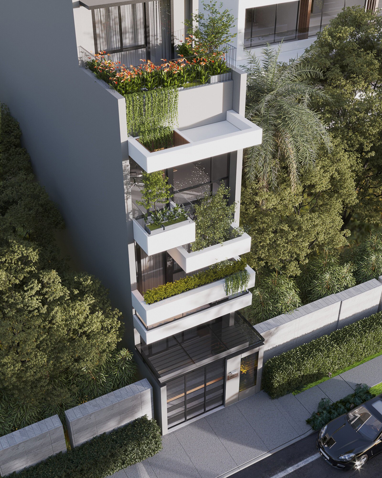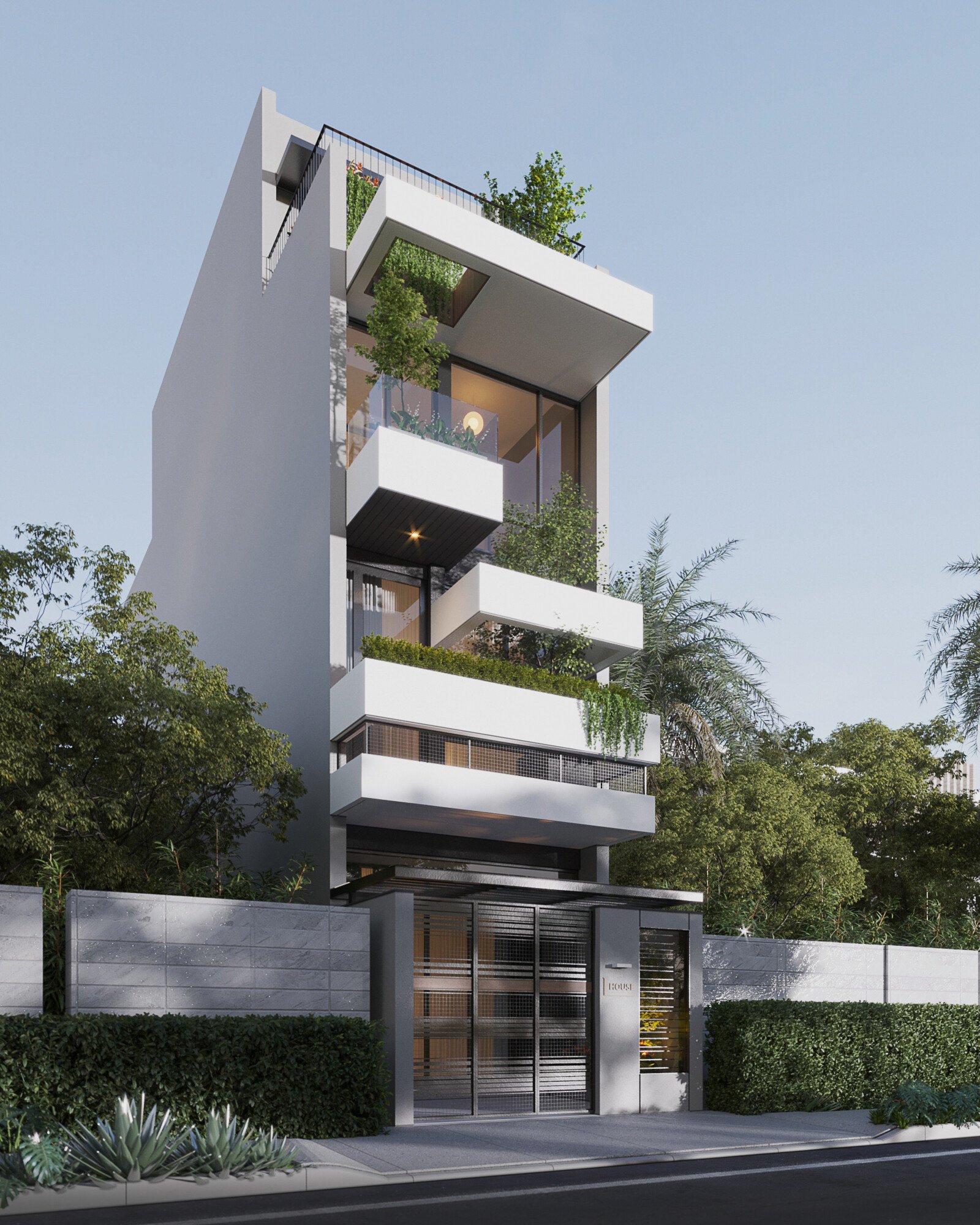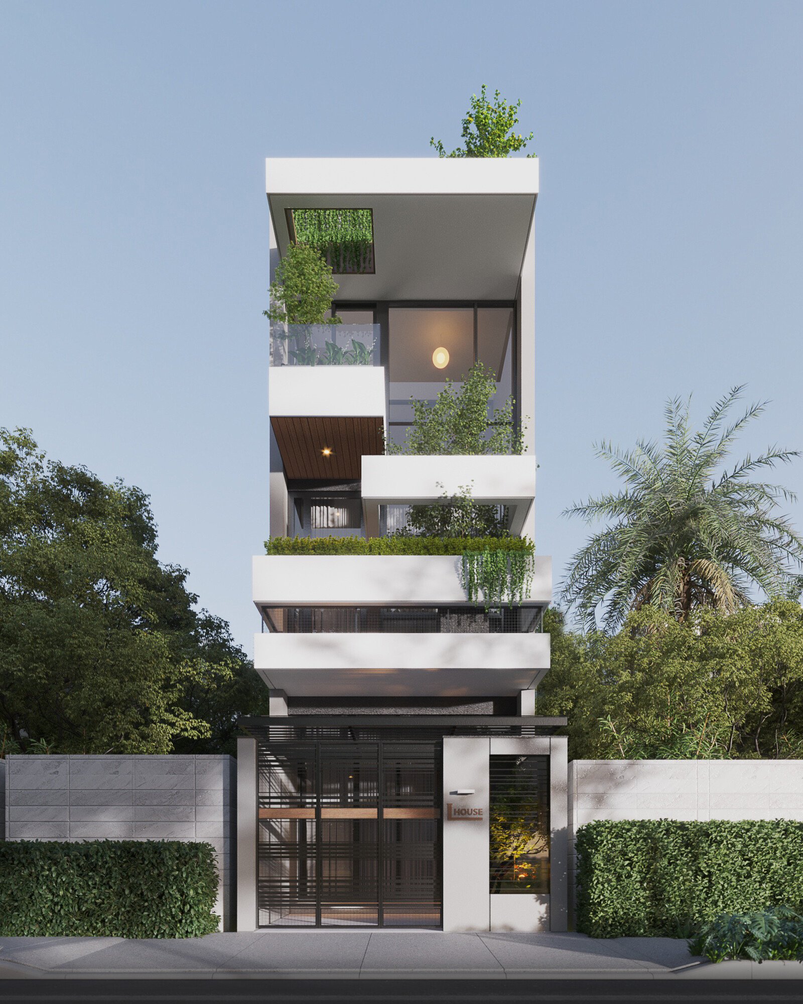 Mỗi tầng mỗi lớp như xếp từng “kỷ niệm” – nơi thành viên gia đình gặp gỡ, làm việc, thư giãn, và riêng tư. Mặt tiền không đơn thuần là “bộ mặt” của ngôi nhà, mà còn là lời mời gọi ánh sáng và gió – để ngôi nhà “sống” chứ không đứng im.