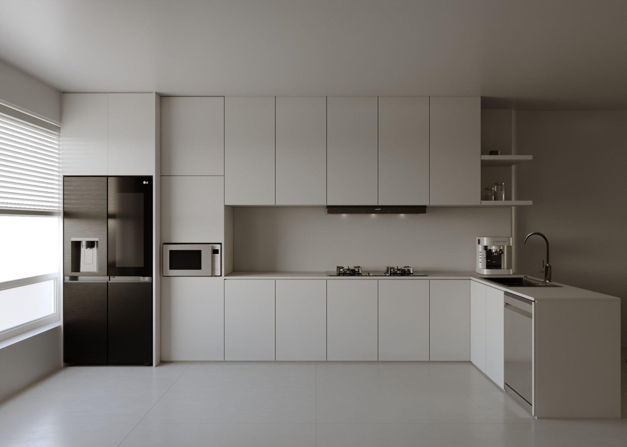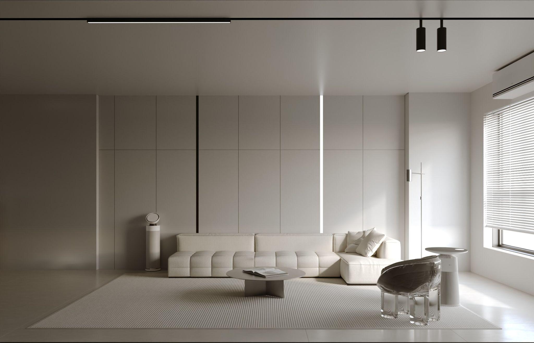 Phòng khách được thiết kế theo hướng mở, kết nối trực tiếp với bếp và khu vực sinh hoạt chung, vừa tiết kiệm diện tích, vừa giữ luồng ánh sáng xuyên suốt. Nội thất được lựa chọn kỹ lưỡng với các món đồ tối giản hình khối, từ sofa đặt sát tường, bàn trà tròn cho đến ghế chân trong. Toàn bộ không gian toát lên sự nhẹ nhàng, sạch sẽ và tĩnh lặng đúng như mong muốn ban đầu của gia chủ.