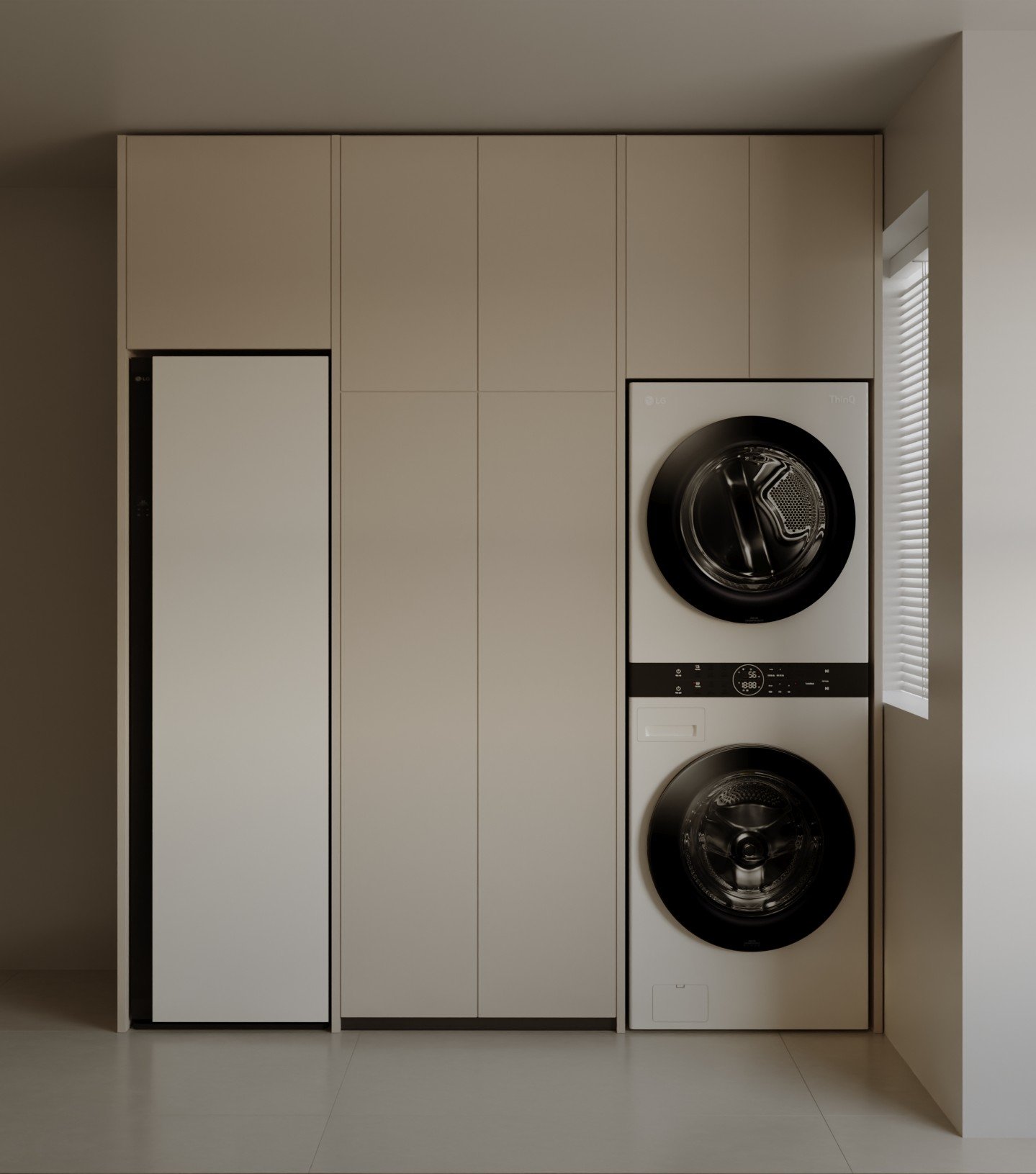 Không gian giặt phơi nằm gọn gàng ở một góc riêng nhưng vẫn đảm bảo đầy đủ công năng. Bộ đôi tháp giặt sấy LG WashTower™ và tủ chăm sóc quần áo thông minh LG Styler được tích hợp vừa vặn trong hệ tủ. Nhờ thiết kế đứng và khả năng kết nối thông minh qua ứng dụng ThinQ, khu giặt là tại TN House trở nên nhỏ gọn nhưng cực kỳ hiệu quả, đặc biệt phù hợp với các căn nhà phố diện tích hạn chế.
