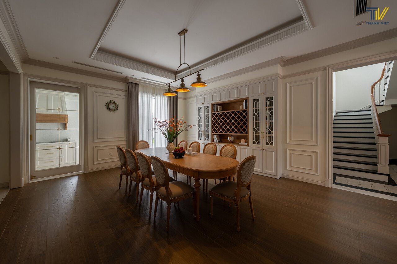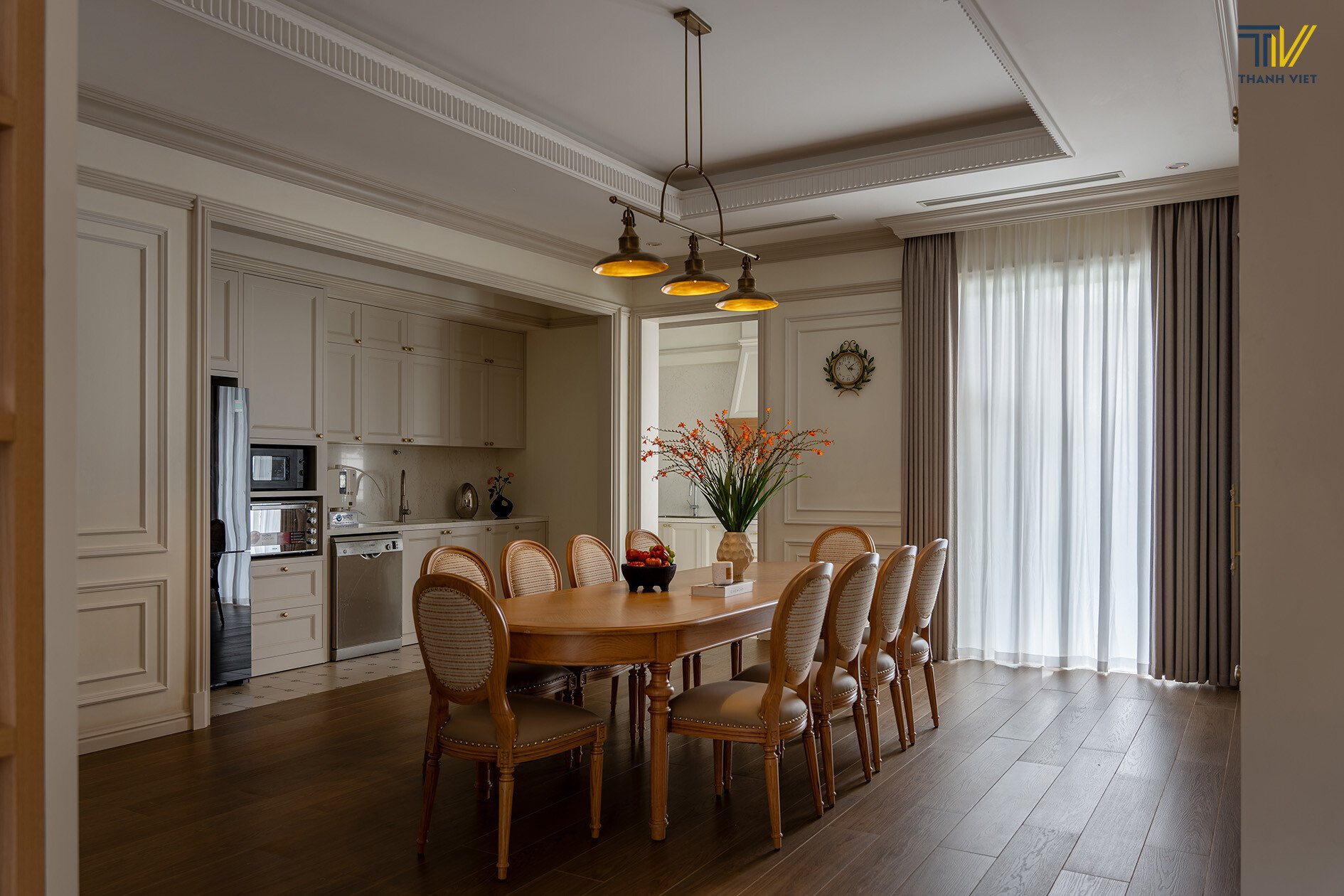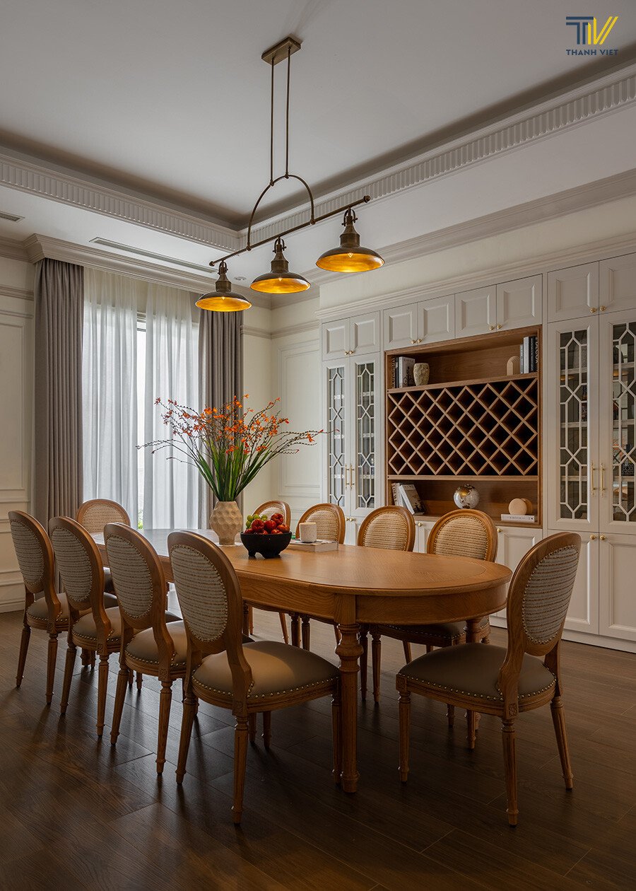 Tâm điểm của không gian này là bộ bàn ăn tám ghế nằm ngay giữa phòng. Được chế tác bằng chất liệu gỗ Sồi Mỹ loại 1 kết hợp vải nỉ Bỉ, bộ bàn ghế mang vẻ đẹp trang nhã, sang trọng và bền vững theo thời gian. Đây cũng là nơi anh chị chủ nhà quây quần mỗi ngày, hay đón tiếp bạn bè bằng những bữa tiệc ấm cúng.