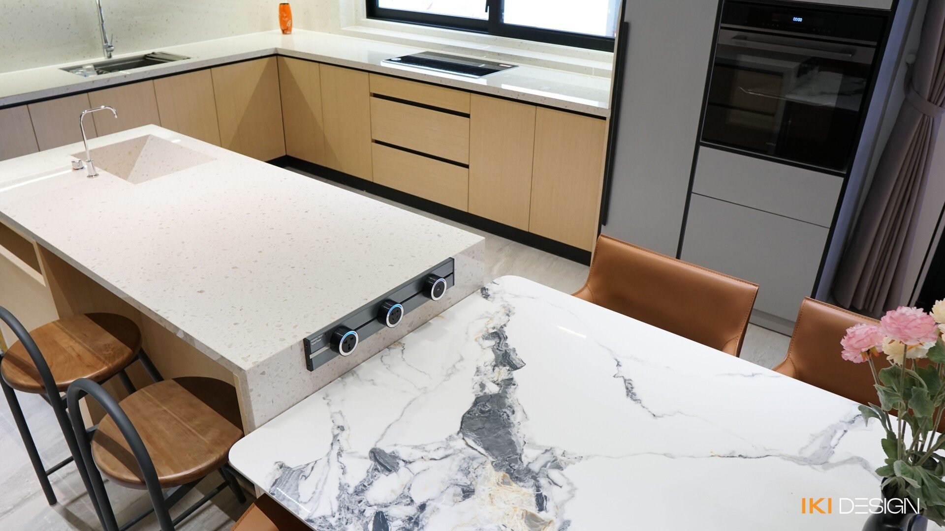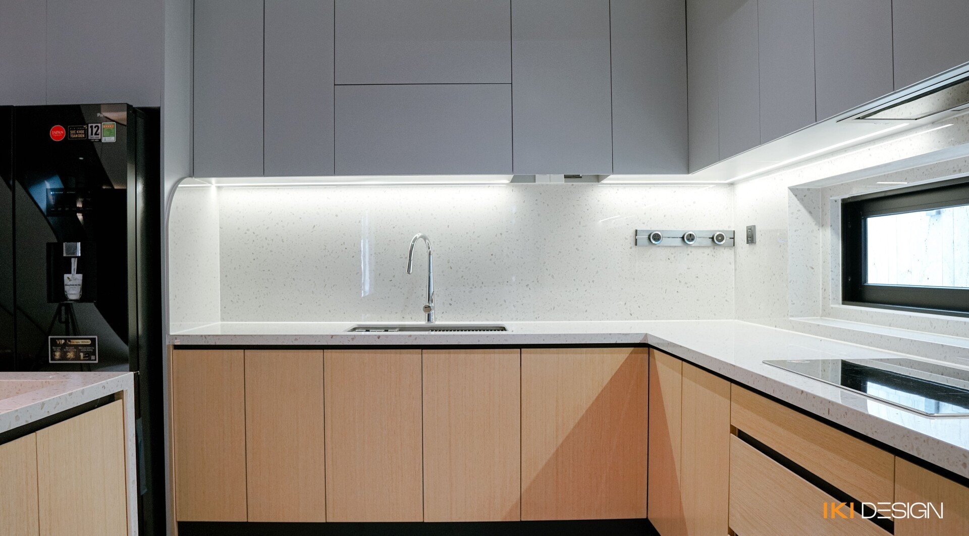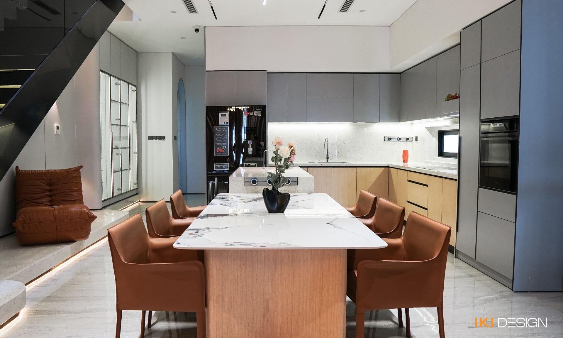 Khu bếp và bàn ăn được bố trí liền kề phòng khách, tạo sự kết nối xuyên suốt. Hệ tủ bếp tối ưu công năng, chất liệu dễ vệ sinh, phù hợp với thói quen nấu nướng của gia đình Việt.