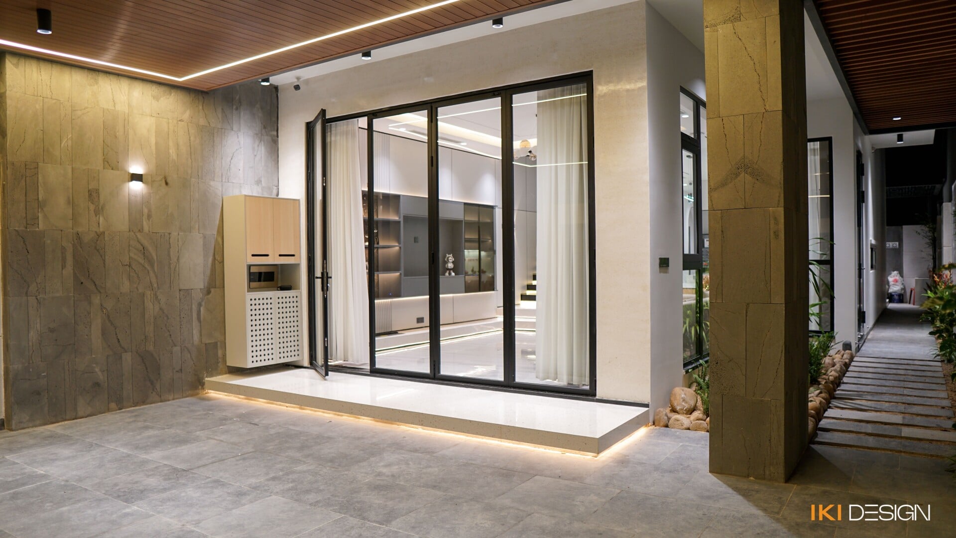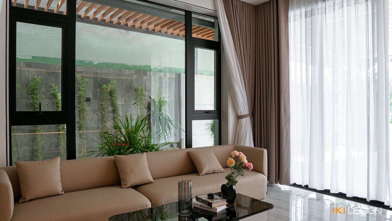 Phòng khách được đặt ở tầng trệt, tận dụng tối đa ánh sáng tự nhiên từ hệ cửa kính lớn. Tone màu trung tính kết hợp cùng chất liệu gỗ và đá mang lại cảm giác sang trọng nhưng vẫn gần gũi.