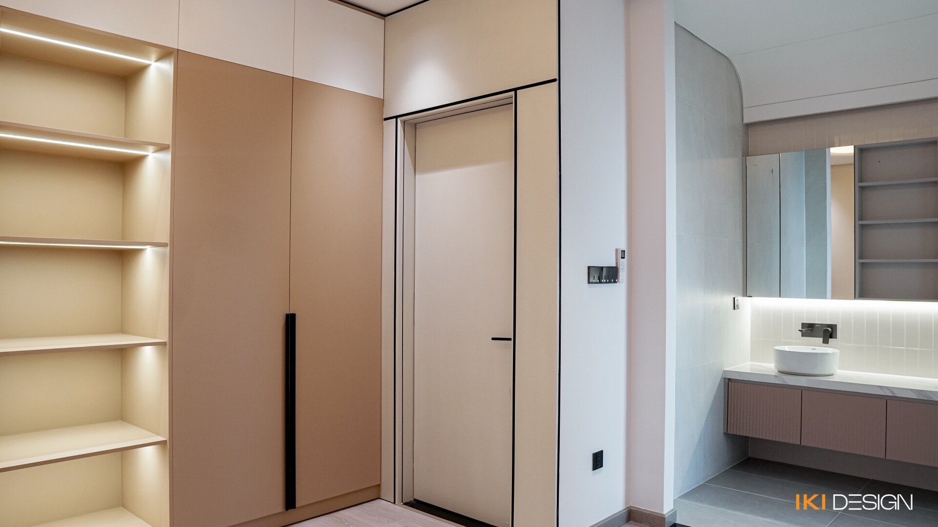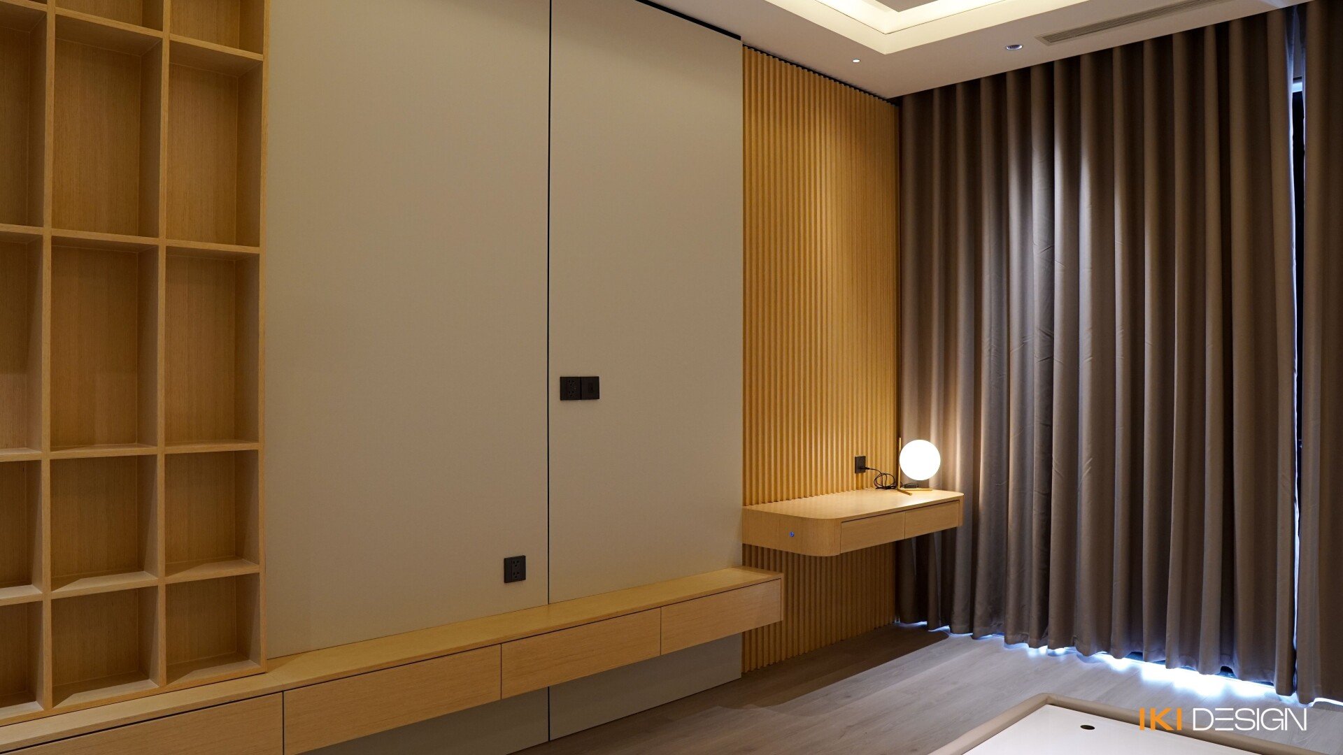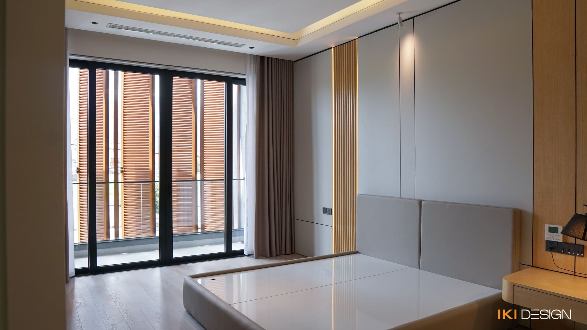 Chất liệu gỗ mộc mạc và điểm xuyết ánh sáng giúp căn phòng trở nên hiện đại nhưng vẫn giữ được sự êm dịu, riêng tư – đúng chuẩn không gian nghỉ ngơi của vợ chồng.