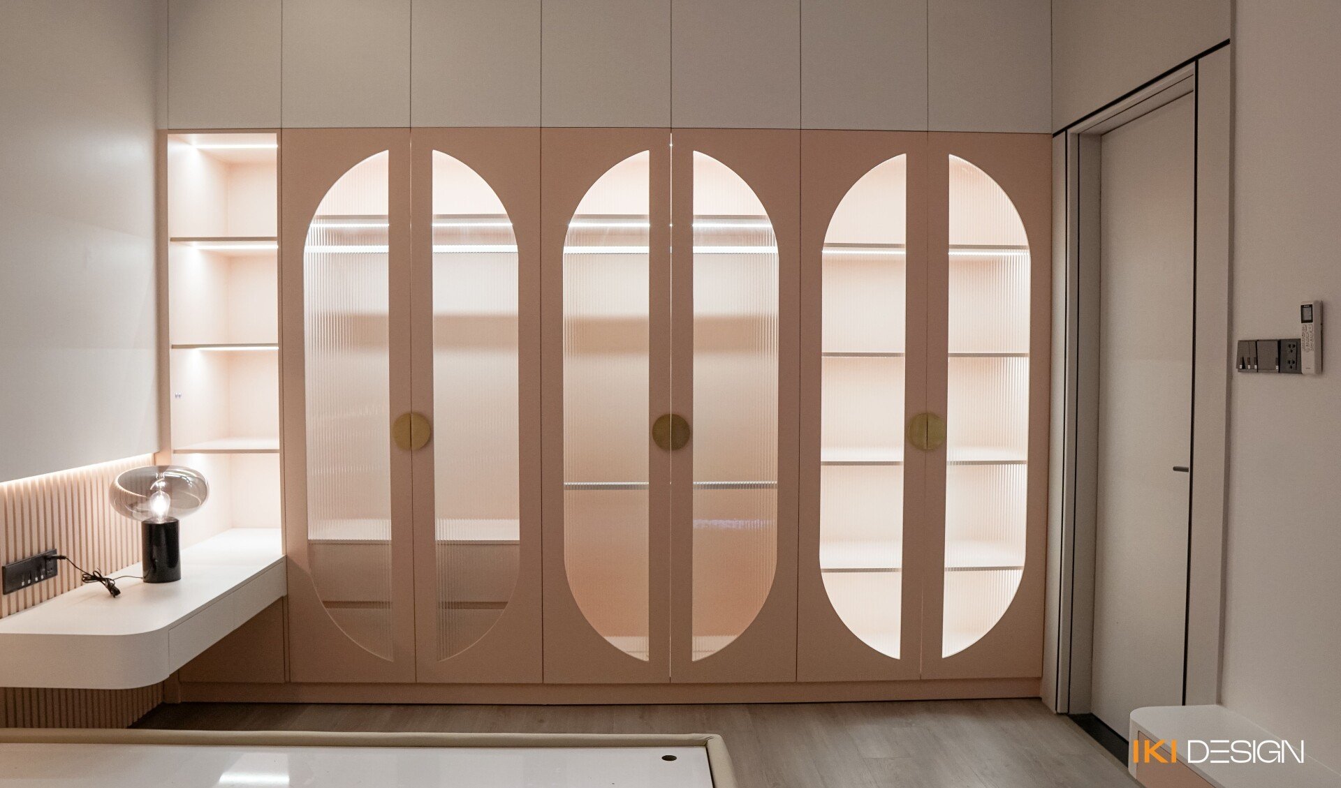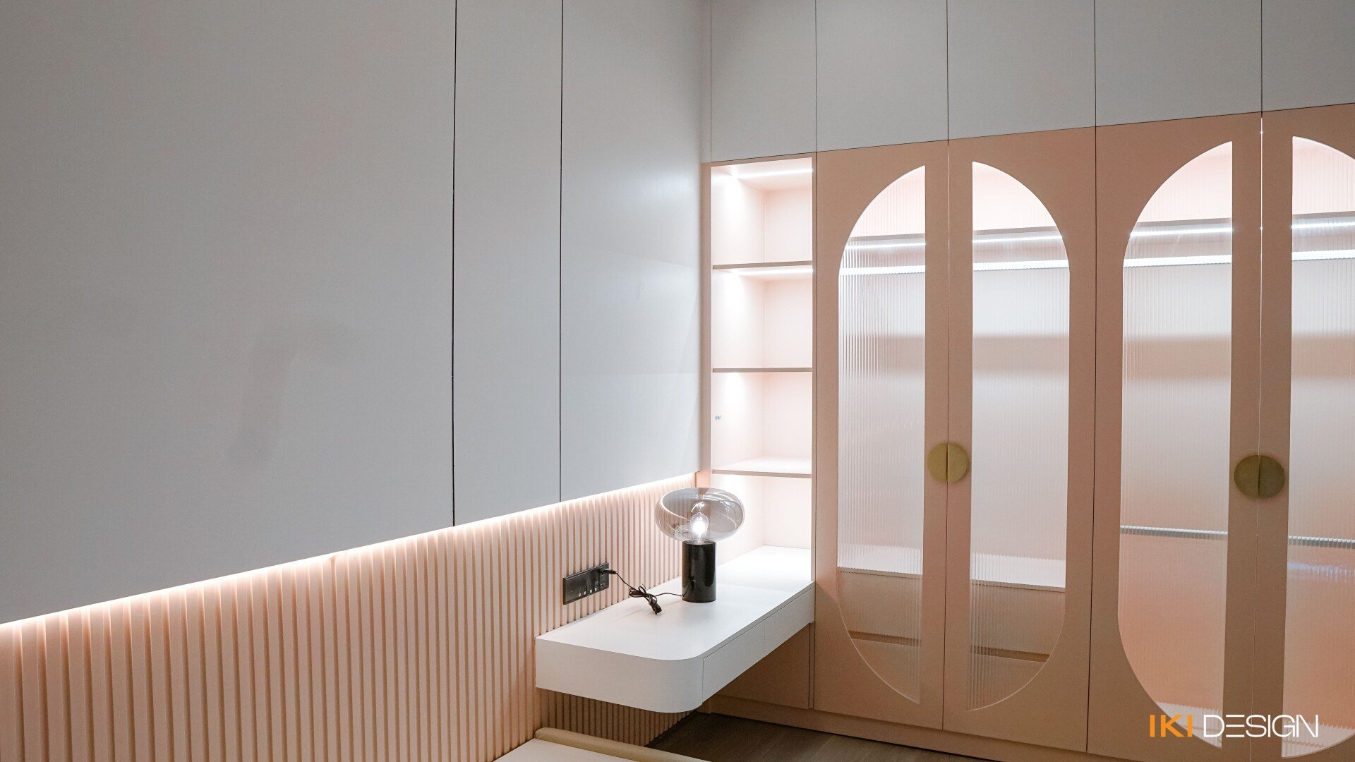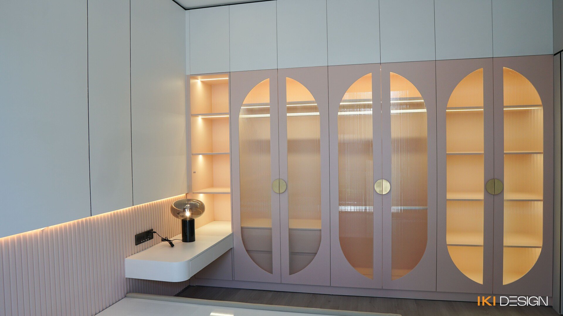 Chất liệu gỗ mộc mạc và điểm xuyết ánh sáng giúp căn phòng trở nên hiện đại nhưng vẫn giữ được sự êm dịu, riêng tư – đúng chuẩn không gian nghỉ ngơi của vợ chồng.