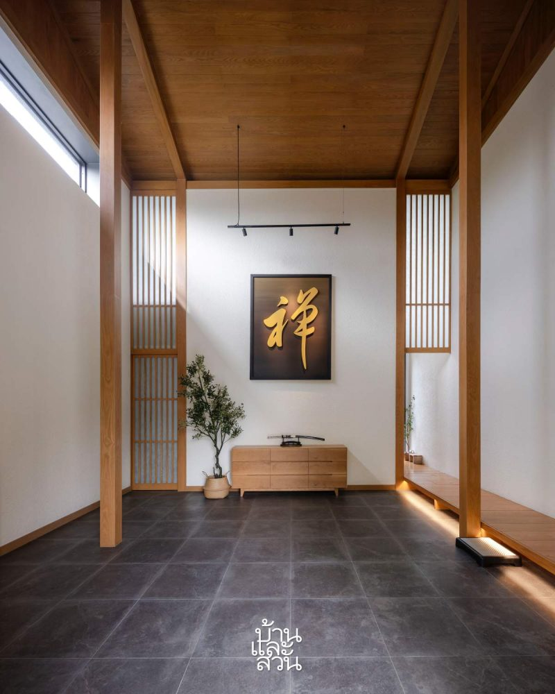 Điểm chạm đầu tiên khi bước vào Ngôi nhà Hạc là sảnh vào cao thoáng, yên tĩnh - một khoảng dừng nhẹ nhàng để buông bỏ sự vội vã ngoài cánh cổng. Trên tường treo khung chữ “禅” hay “Chan” trong tiếng Quan Thoại, tương tự chữ “Zen” trong tiếng Nhật - định nghĩa rõ tinh thần của ngôi nhà: giản dị, thanh tĩnh và sâu lắng. Cột và trần nhà sử dụng chất liệu gỗ chủ đạo, bậc thềm ngồi tháo giày mô phỏng genkan trong nhà Nhật. Tất cả đều theo mong muốn của gia chủ, gợi nhớ đến tuổi thơ lớn lên trong văn hóa và hoạt hình Nhật Bản như Doraemon, Naruto, Dragon Ball hay One Piece. Anh yêu cầu kiến trúc sư gìn giữ hương vị Nhật truyền thống nhưng pha vào sự mạch lạc của phong cách Modern Japanese, tạo nên chất riêng cho ngôi nhà.