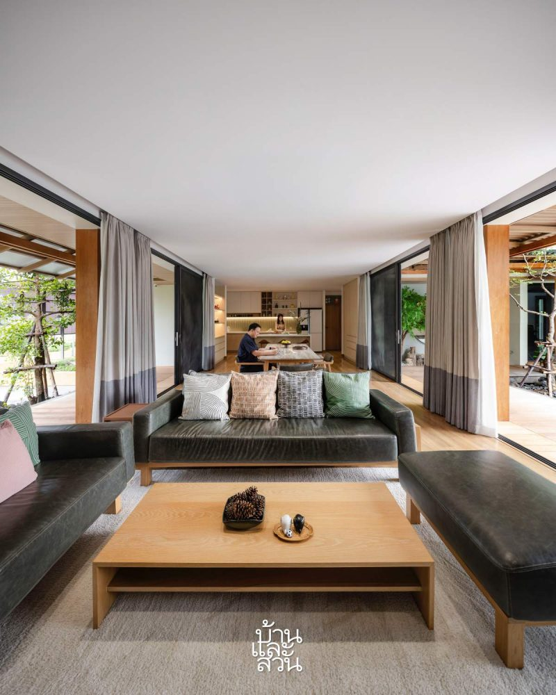 Phòng khách, phòng ăn và bếp liên thông trong không gian mở, có tầm nhìn cả 2 phía, cho phép các thành viên có thể tương tác với vườn xung quanh nhà cũng như đón gió mát cả ngày