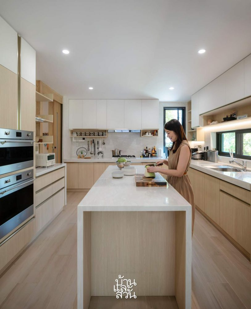 Bếp là khu vực yêu thích của người vợ. Nội thất bếp khá đơn giản nhưng tinh tế, sạch sẽ với tông màu gỗ sáng