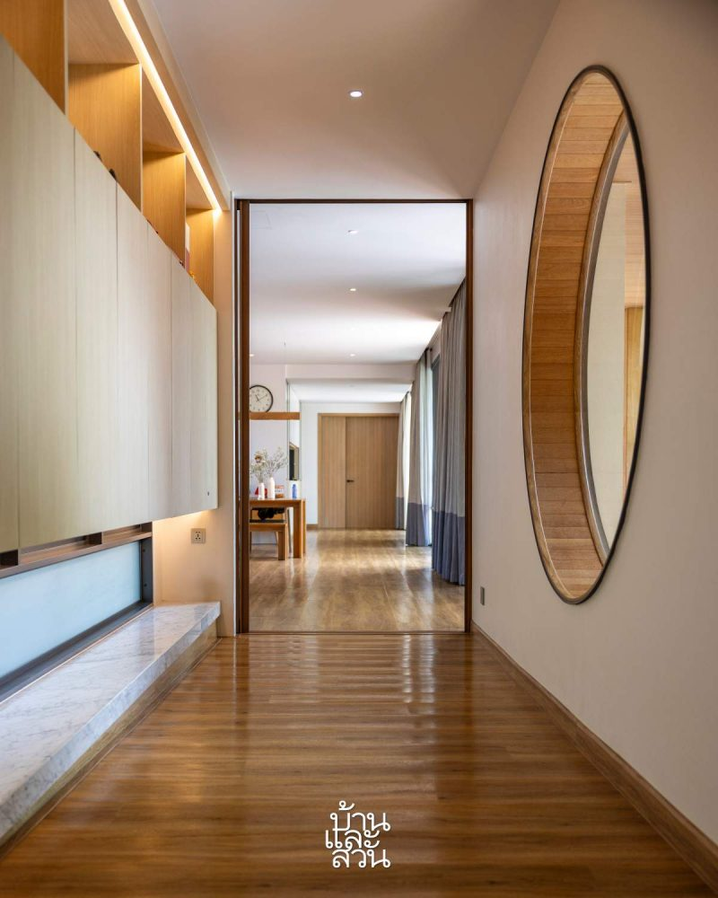 Một chiếc tủ âm tường được thiết kế bên trái hành lang di chuyển trong nhà. Bên phải là cửa sổ tròn để đón ánh sáng tự nhiên, cho phép các thành viên có thể ngồi đây để đọc sách
