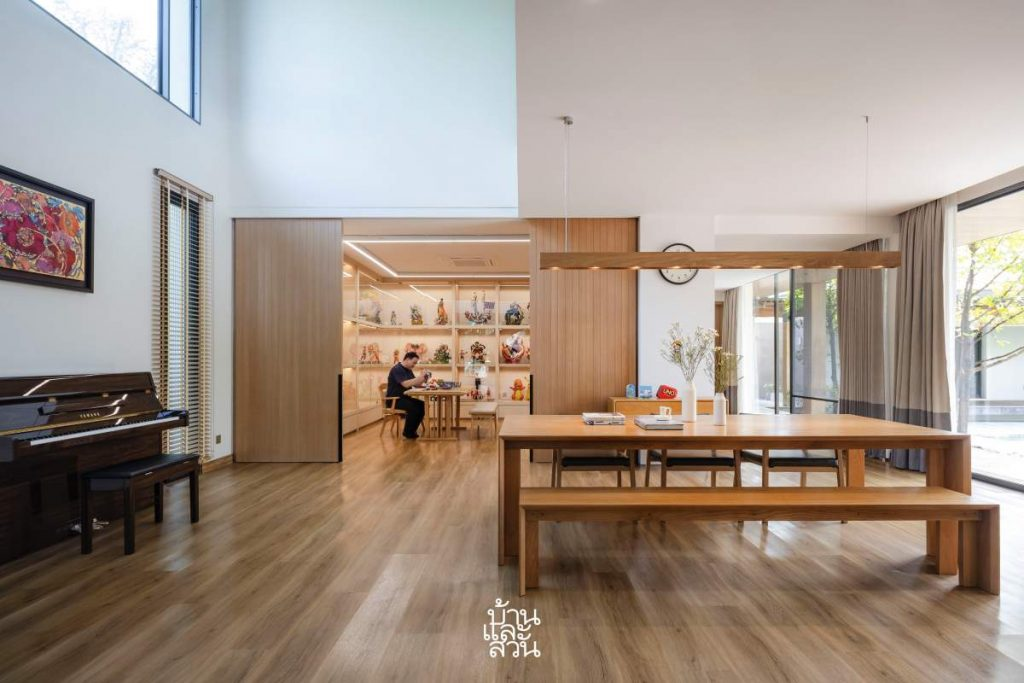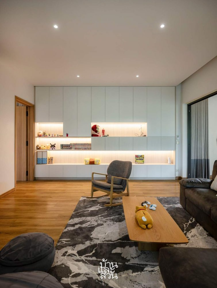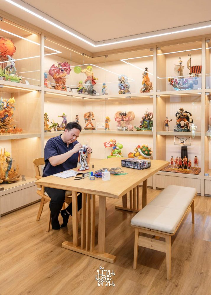 Vật dụng hay dùng được đặt gần tầm tay, trong khi những món ít dùng như đồ chơi và mô hình của người chồng được đưa vào phòng lưu trữ bí mật, một không gian ẩn sau cửa trượt lớn bằng gỗ. Đây là “kho báu tuổi thơ” của anh, nơi chứa đầy đồ sưu tầm Nhật Bản trải từ sàn đến trần, được trưng bày trên hệ kệ thiết kế riêng. Giữa phòng đặt một bàn gỗ để anh làm mô hình, thỏa mãn sở thích gắn bó từ nhỏ. Kiến trúc sư gọi đây là “lát cắt cảm xúc” của chủ nhà, nơi người lớn vẫn có thể trở về làm một đứa trẻ trong phút chốc.