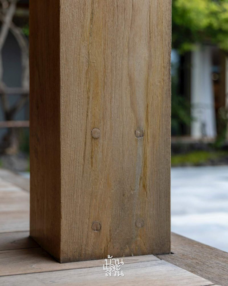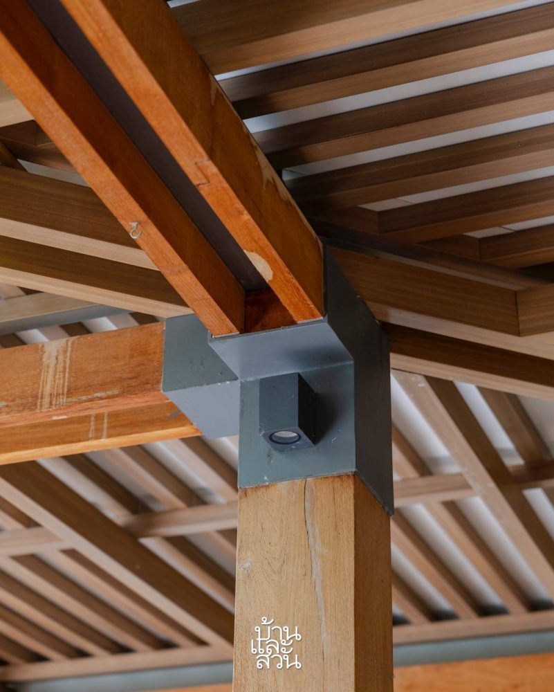 Mối nối giữa cột và dầm gỗ ở hiên được gia cố và che bằng thép, đồng thời lắp đặt đèn chiếu sáng