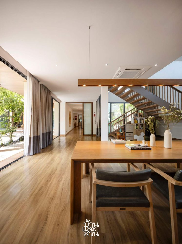 Một yêu cầu quan trọng mà chủ nhà đặt ra là ngôi nhà phải thoáng và ban ngày không cần sử dụng điều hòa. Vì vậy mọi khu vực đều có thể mở hoàn toàn, cho phép gió đi xuyên suốt toàn bộ công trình. Tại tầng hai, hành lang được che nắng bằng các tấm lam gỗ, cho phép gió lùa nhẹ và che bớt ánh nắng gắt. Ánh sáng tự nhiên được dẫn vào theo những khe sáng và ô cửa được tính toán cẩn thận, giúp không gian sáng thoáng, giảm tiêu thụ năng lượng và mang lại cảm giác thanh sạch đúng tinh thần sống khỏe của người Nhật.
