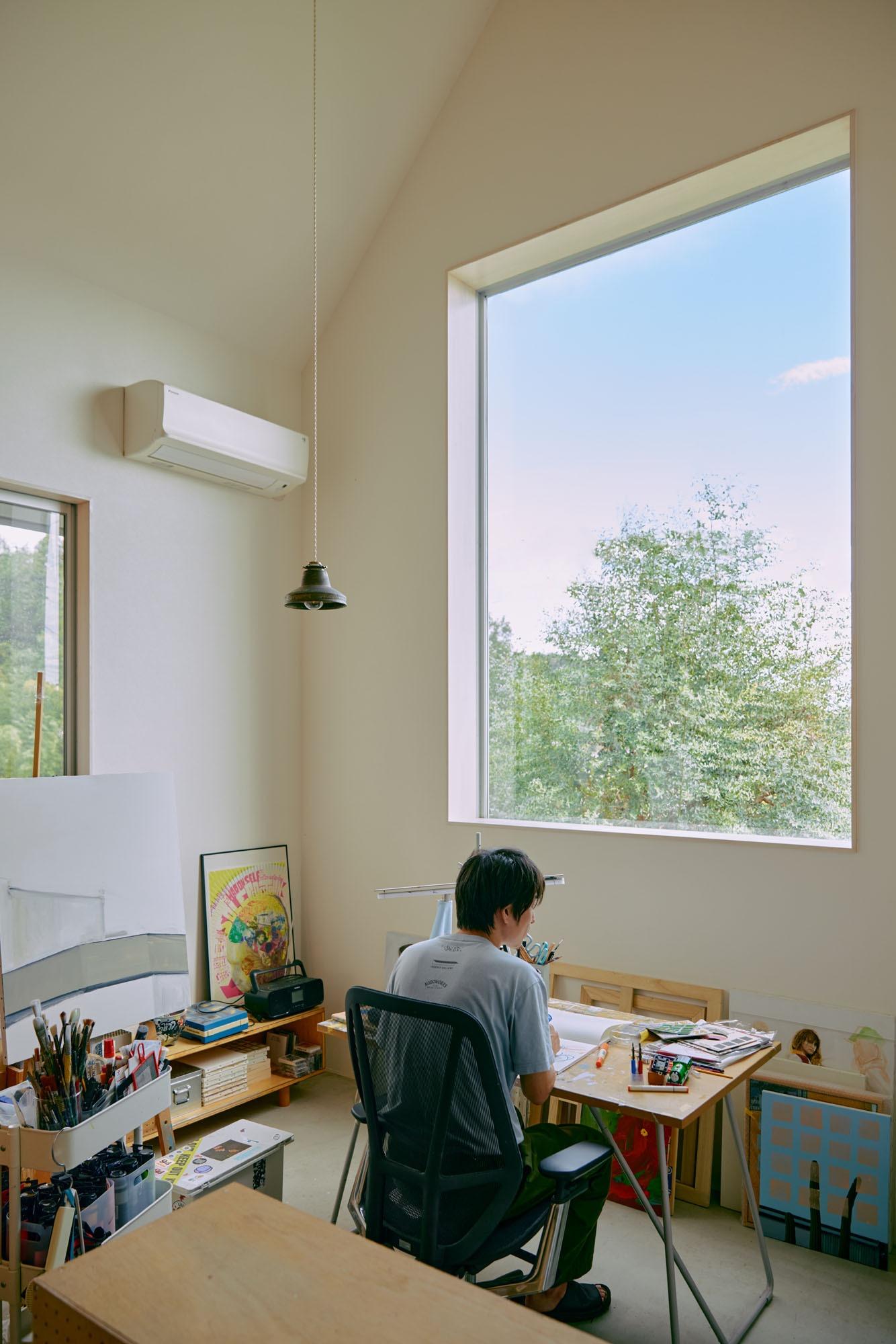 Studio của Hiromasa nằm trên sườn đồi hướng Đông với tầm nhìn thoáng rộng, đón trọn ánh nắng chiếu vào từ khung cửa lớn. Đặc biệt, nhờ thiết kế mở và không có cửa ngăn, việc mang dụng cụ vẽ, những bức tranh canvas lớn vào bên trong trở nên dễ dàng hơn.