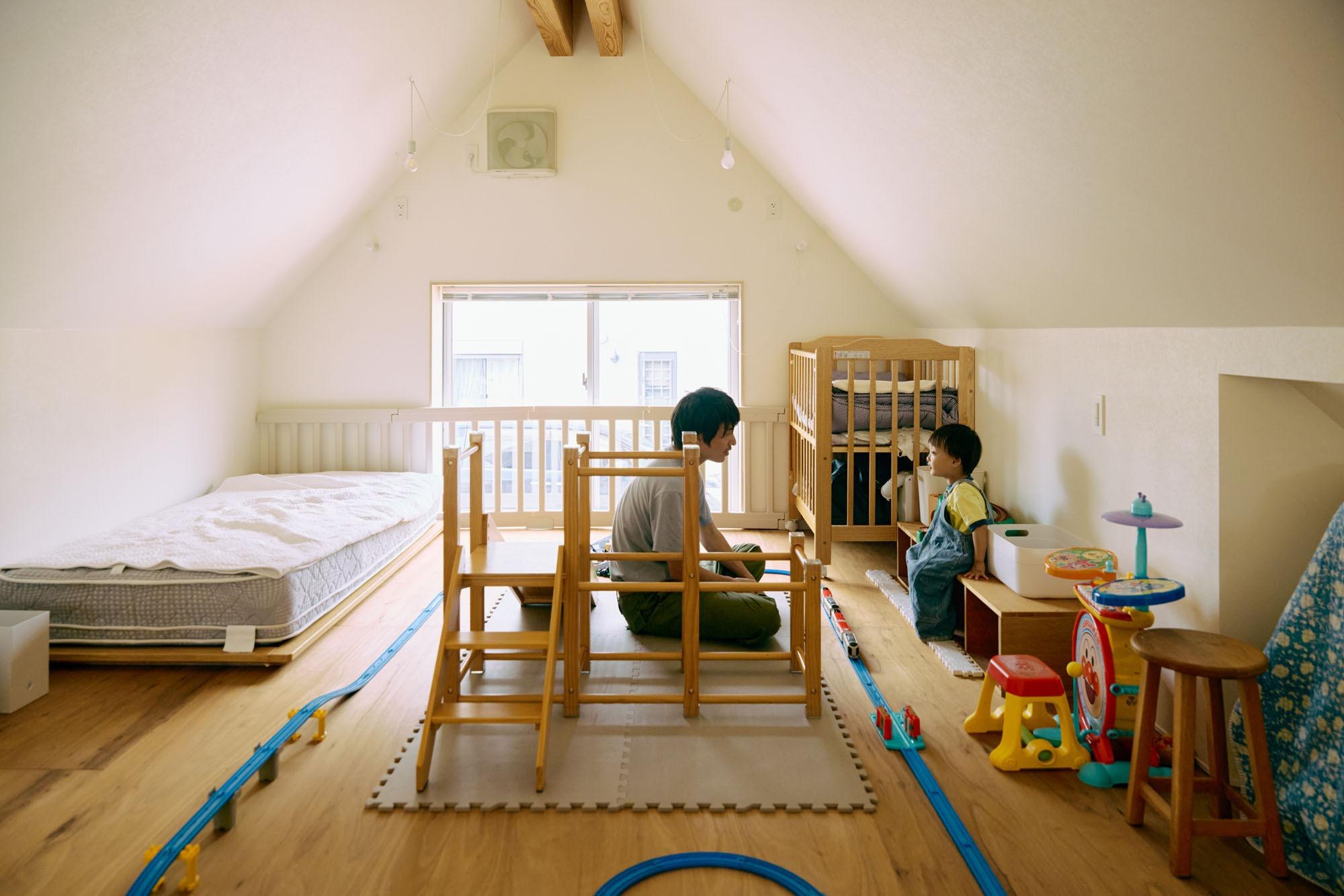 Gác lửng nhỏ gọn trở thành thế giới riêng của gia đình với chiếc giường ngủ và góc vui chơi đầy màu sắc. Ánh sáng tự nhiên và vật liệu gỗ mang lại sự gần gũi, thân thuộc
