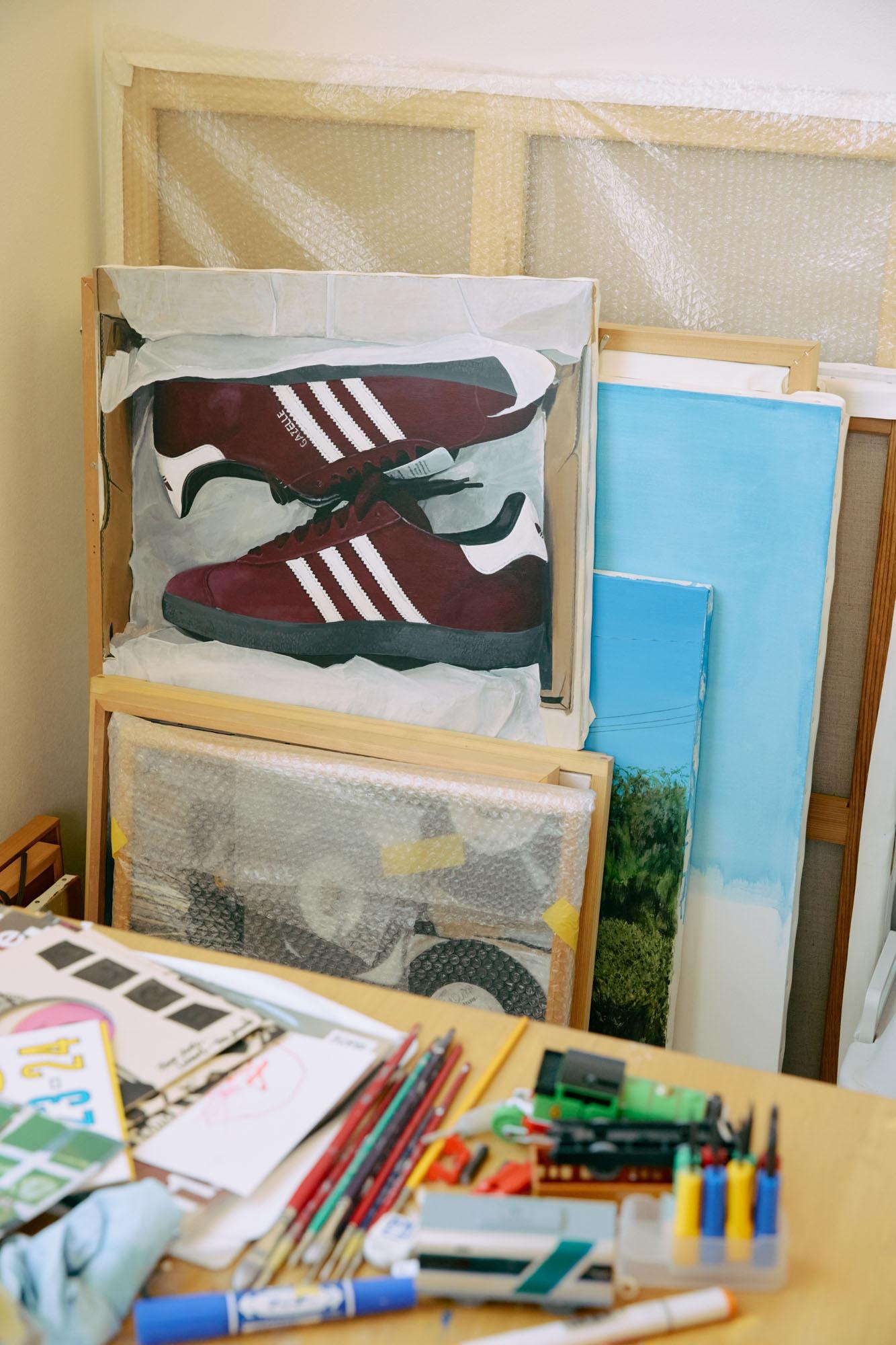 Vật dụng và tranh sắp xếp gọn gàng với đầy màu sắc khác nhau. Những tác phẩm dở dang phản chiếu niềm yêu thích và sự sáng tạo không ngừng