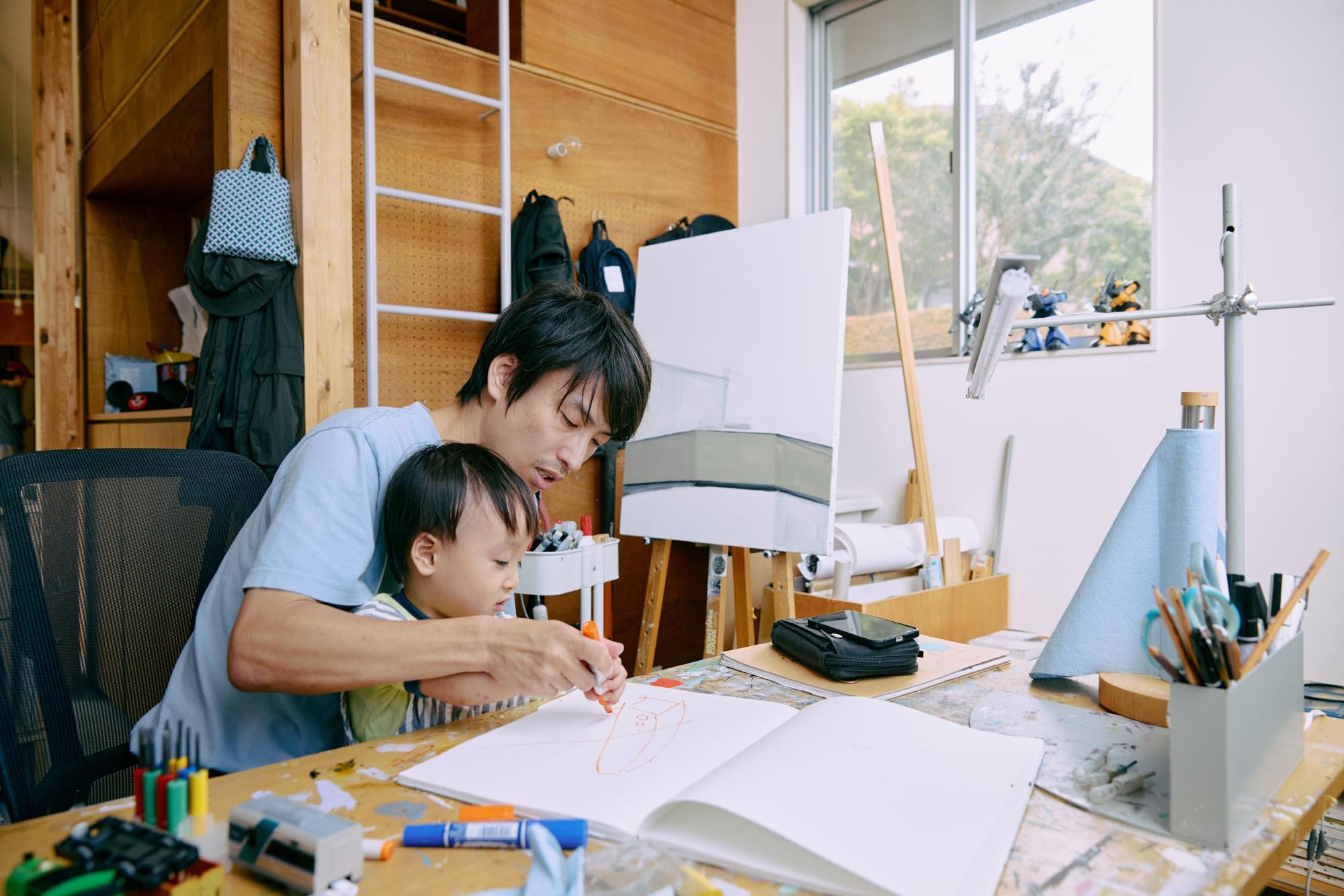 Khoảnh khắc Hiromasa cùng con trai vẽ những nét đầu tiên. Góc làm việc nhỏ bỗng trở thành nơi lưu giữ những khoảnh khắc ấm áp