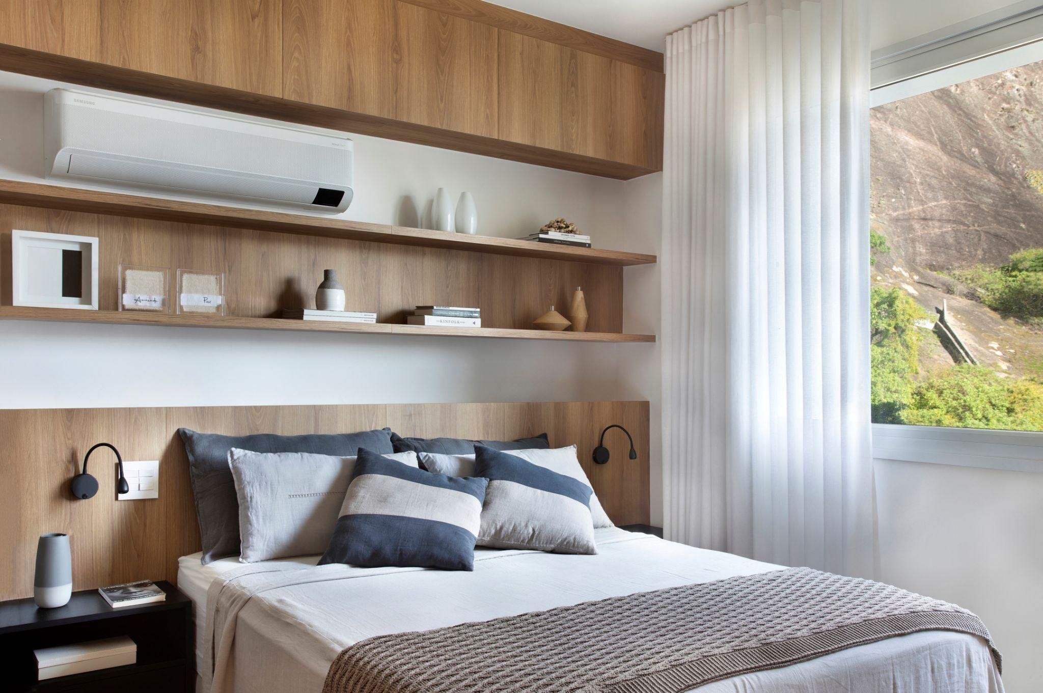 Phòng ngủ sử dụng bảng màu trung tính kết hợp hệ kệ gỗ dài liền trần để tạo chiều sâu và tối ưu lưu trữ. Cửa sổ lớn đón ánh sáng tự nhiên, đồng thời mở ra tầm nhìn hướng núi, đem lại cảm giác nghỉ dưỡng