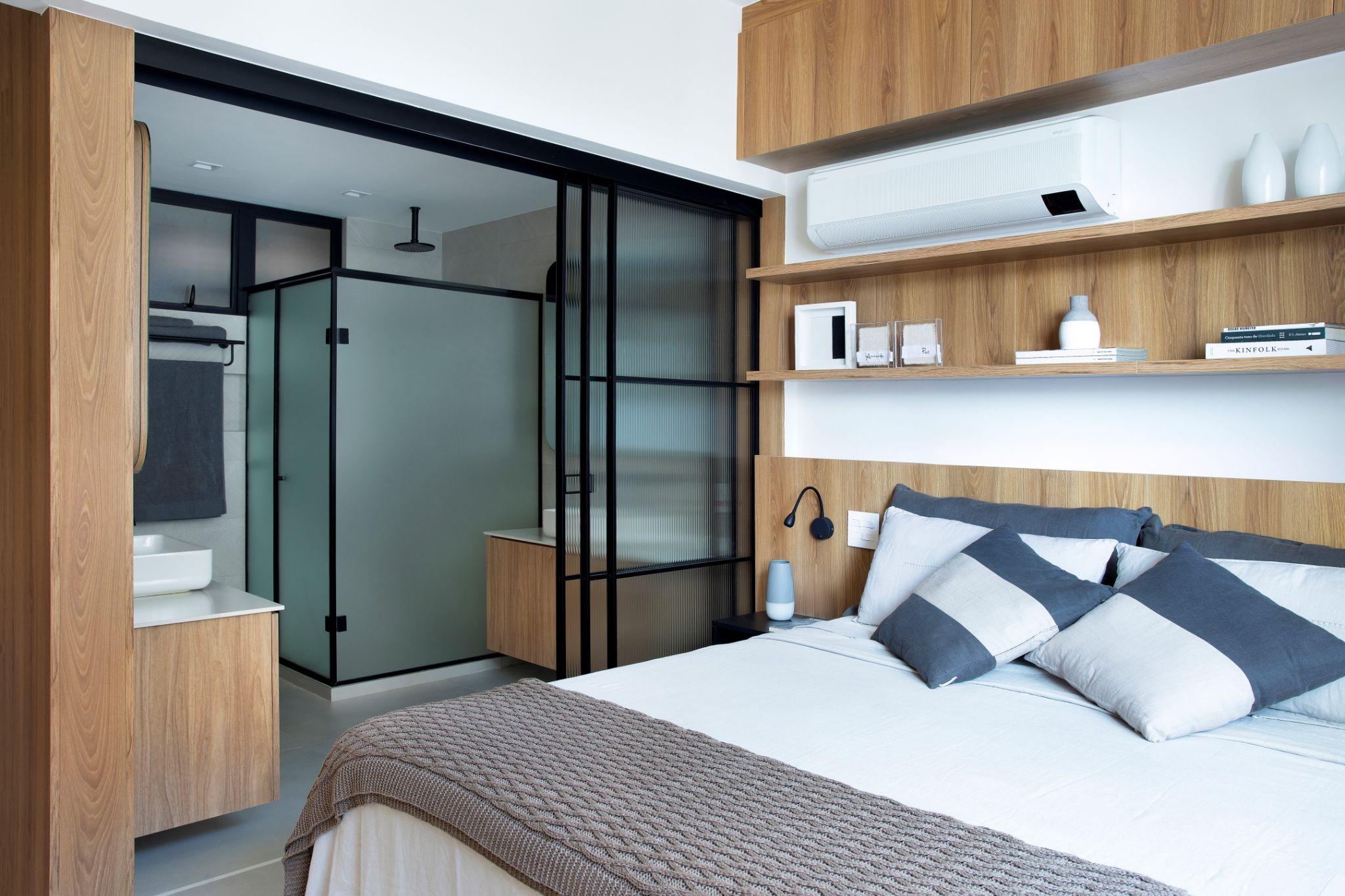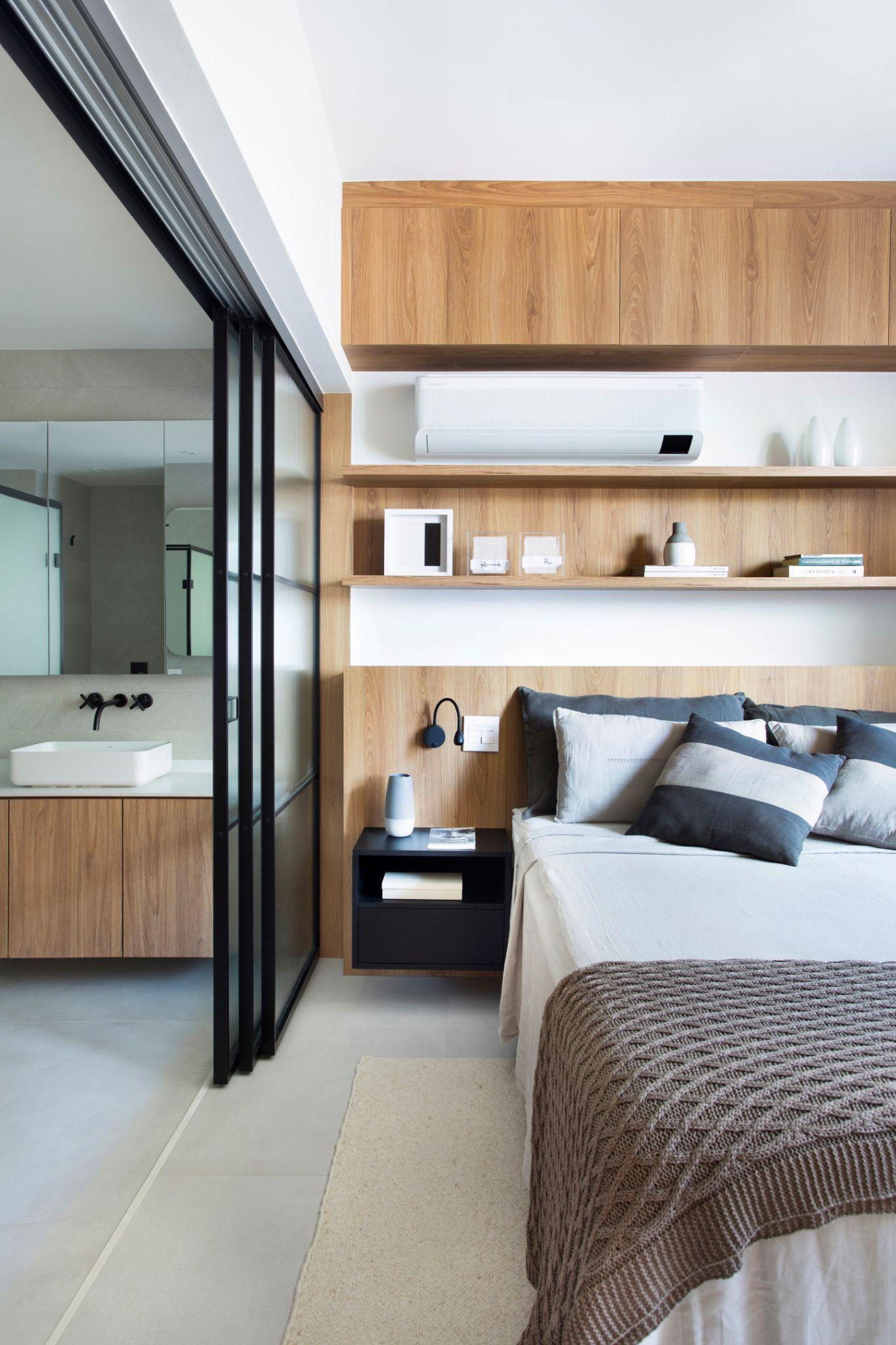 Cấu trúc phòng ngủ - phòng tắm liền mạch với cánh cửa trượt tạo cảm giác mở nhưng vẫn có lớp lọc ánh sáng. Việc sử dụng tủ gỗ, tường trắng và nội thất thấp giúp duy trì sự thoáng đãng đặc trưng của căn hộ