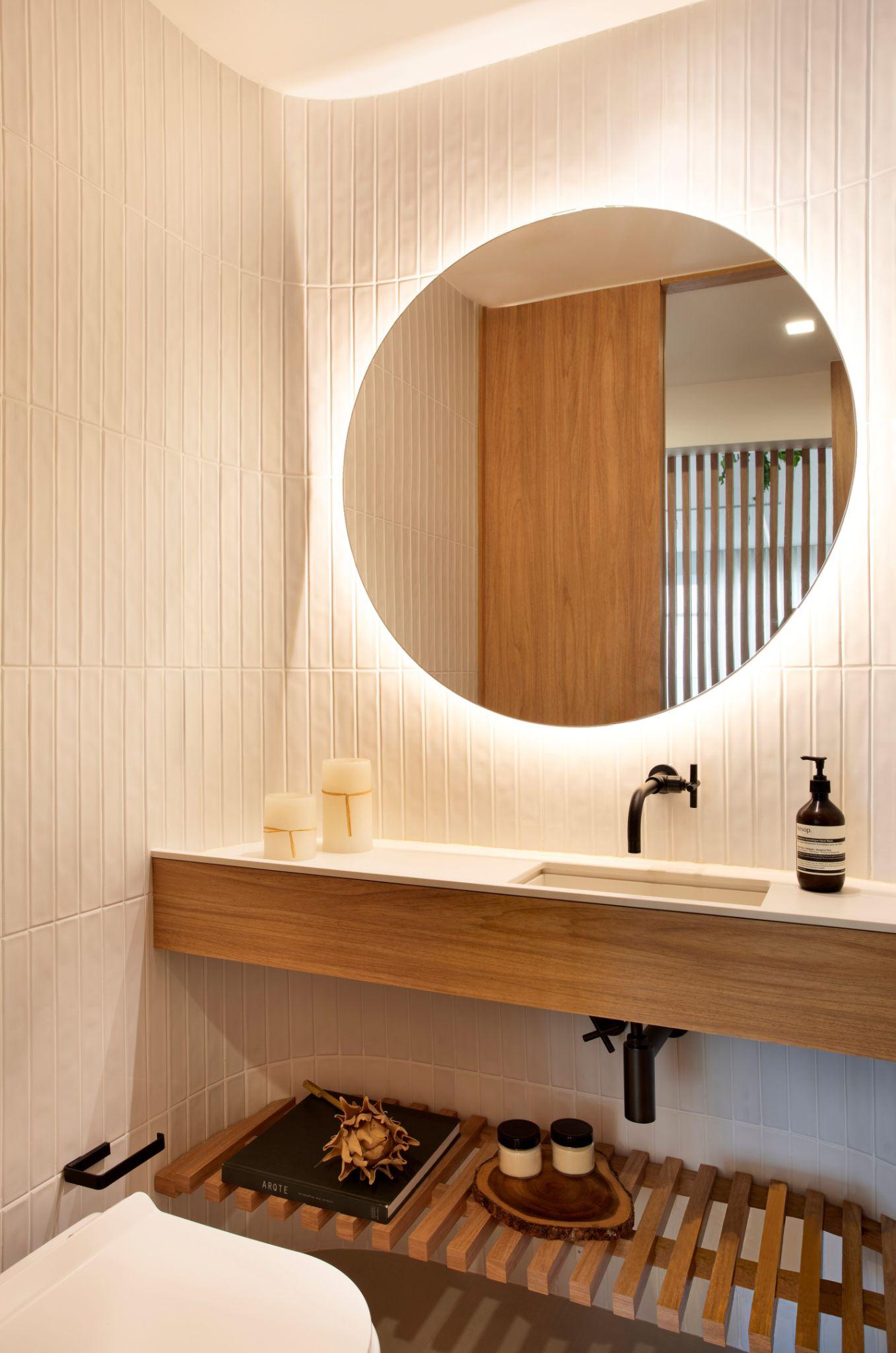 Phòng tắm được hoàn thiện bằng gạch đứng màu trắng và gương tròn lớn tạo cảm giác rộng và thoáng hơn diện tích thật. Việc bo cong các góc tường và dùng ánh sáng sau gương giúp không gian mềm mại, đồng nhất với phong cách của toàn căn hộ