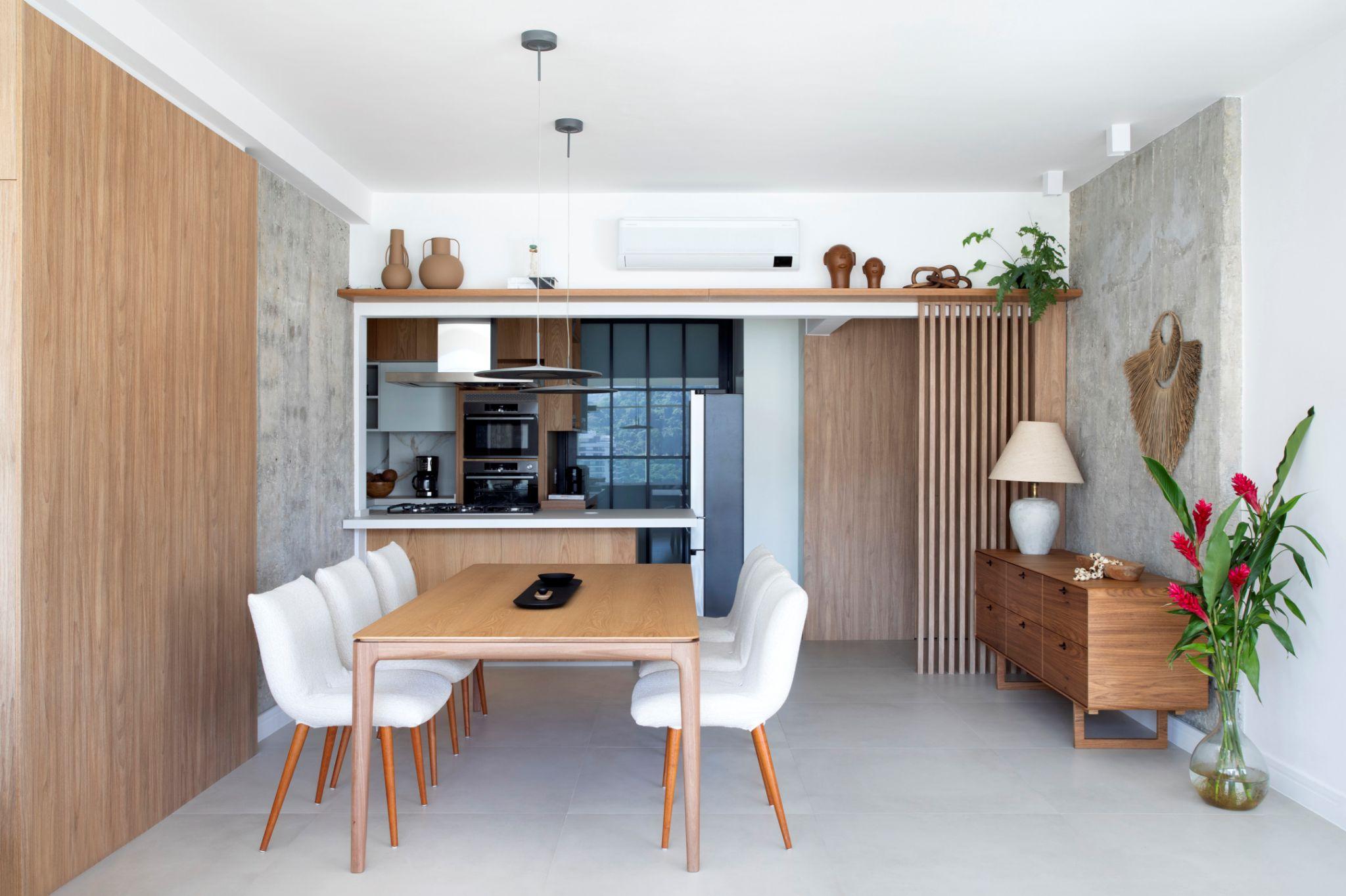 Kết hợp bê tông thô để lộ cột, dầm với gỗ Tauari ấm, tạo nên sự tương phản thú vị giữa thô mộc và tinh tế.