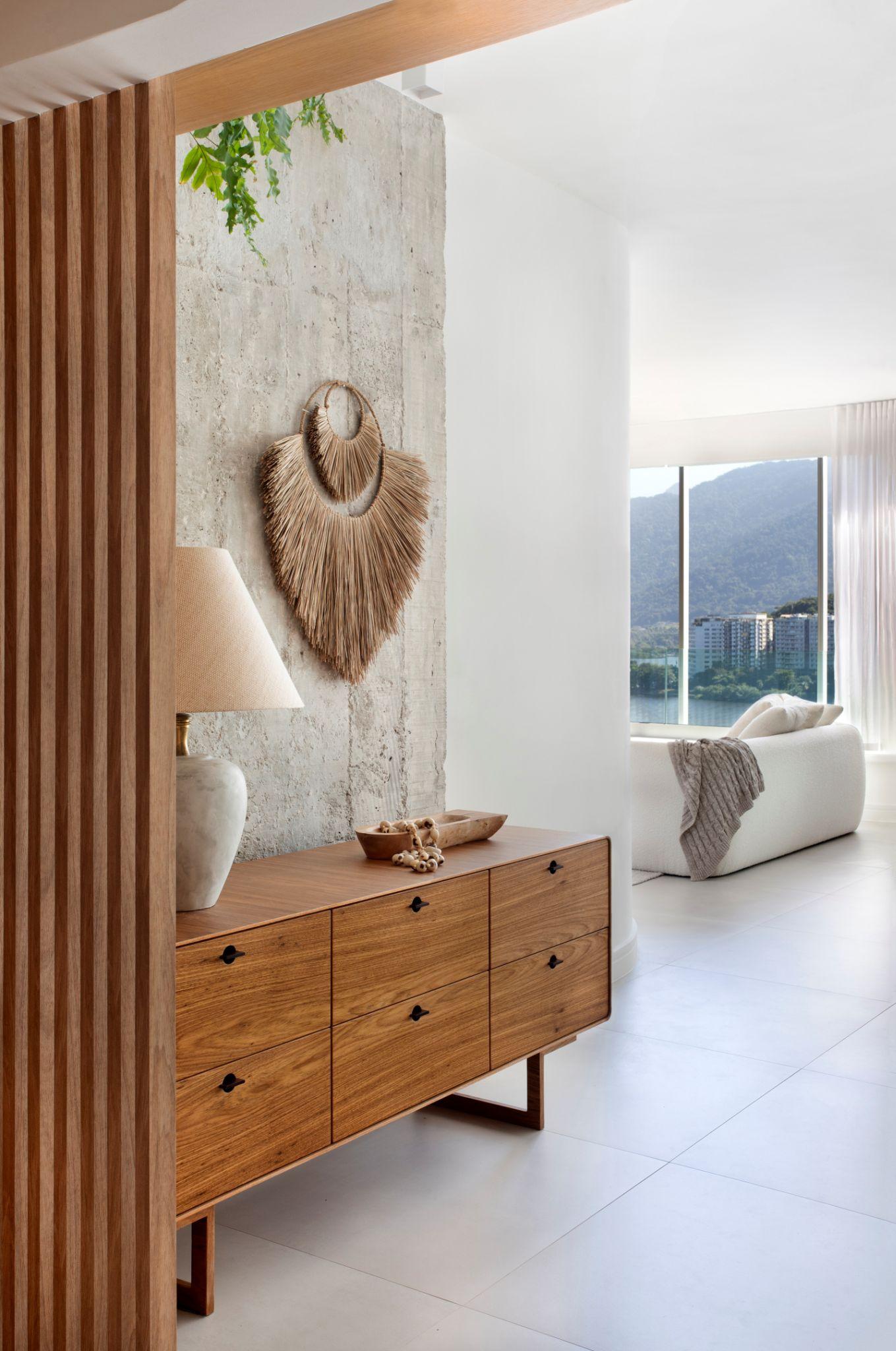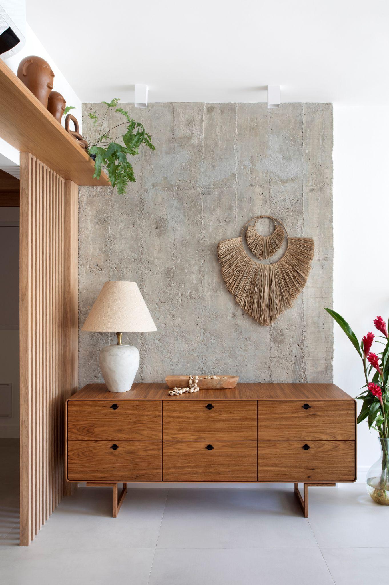 Tủ console gỗ nằm trước mảng tường bê tông, được trang trí bằng đèn bàn đá và phụ kiện mây tre. Sự kết hợp giữa vật liệu thô - ấm giúp hình thành bản sắc nội thất tự nhiên, mang hơi hướng Brazil đương đại