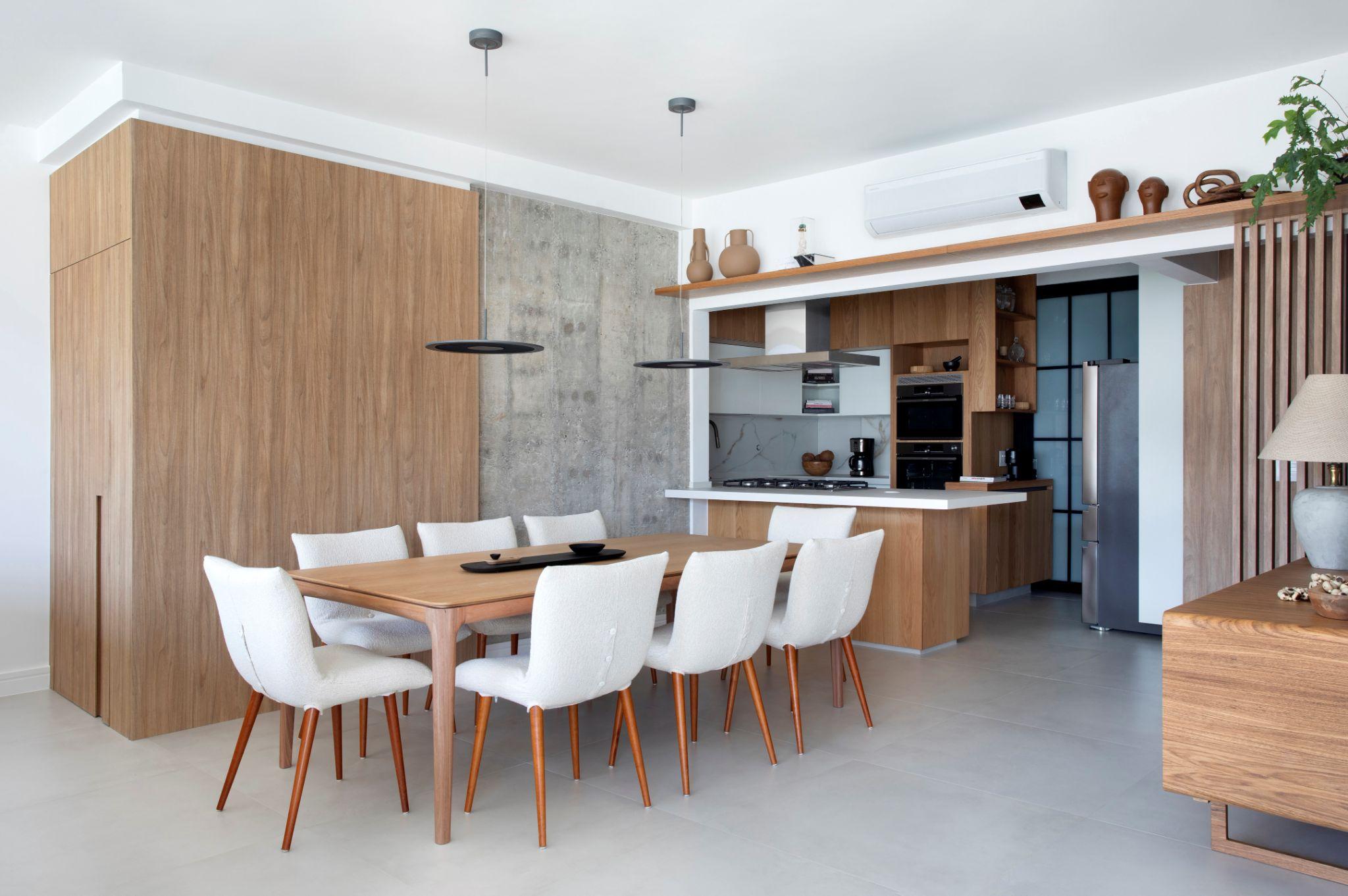 Phòng ăn nối liền bếp với bàn gỗ dài và ghế bọc vải sáng màu, đặt cạnh mảng tường gỗ và bê tông. Bố cục sử dụng gam màu ấm và vật liệu tối giản để giữ sự thông thoáng, đồng thời đồng bộ với toàn bộ căn hộ