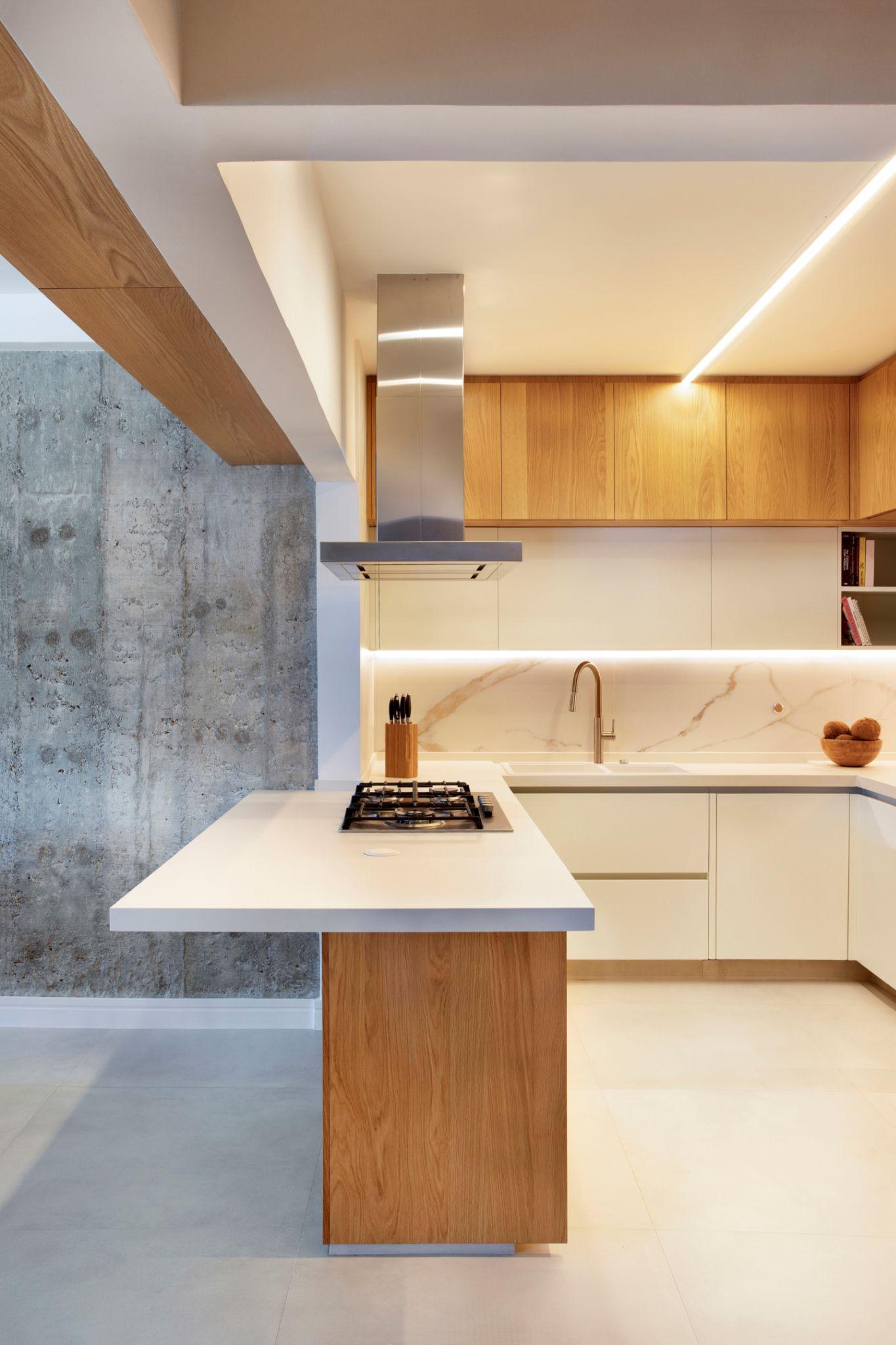 Bếp chữ U với tủ gỗ và mặt bàn trắng, kết hợp tường bếp ốp porcelain vân đá tạo cảm giác sạch sẽ và hiện đại. Thiết kế đảo bếp gắn bếp nấu giúp tối ưu thao tác và tăng sự kết nối giữa bếp - phòng ăn