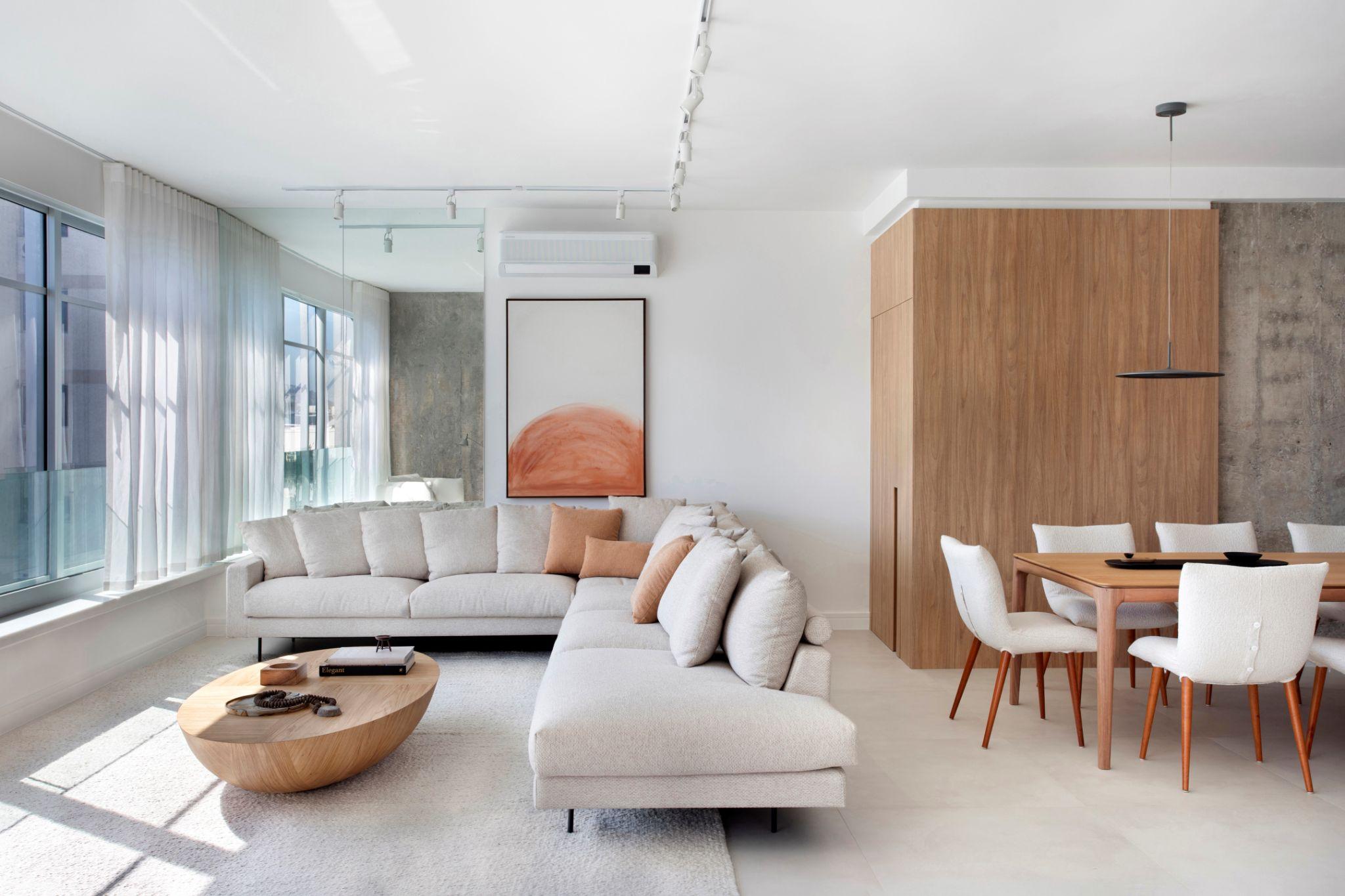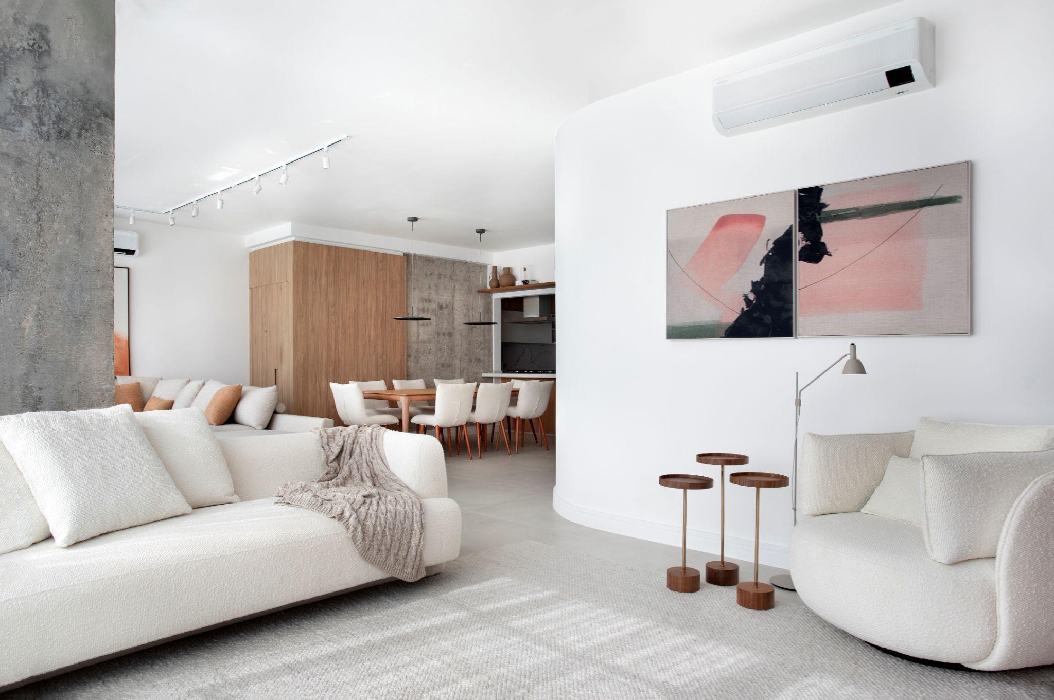 Phòng khách - phòng ăn được kết nối trong một mặt bằng mở với sofa lớn và bàn gỗ thấp đặt ở trung tâm. Thiết kế sử dụng sắc trắng - be và điểm nhấn gỗ Tauari để tạo cảm giác thư thái, đồng thời mở rộng chiều sâu không gian
