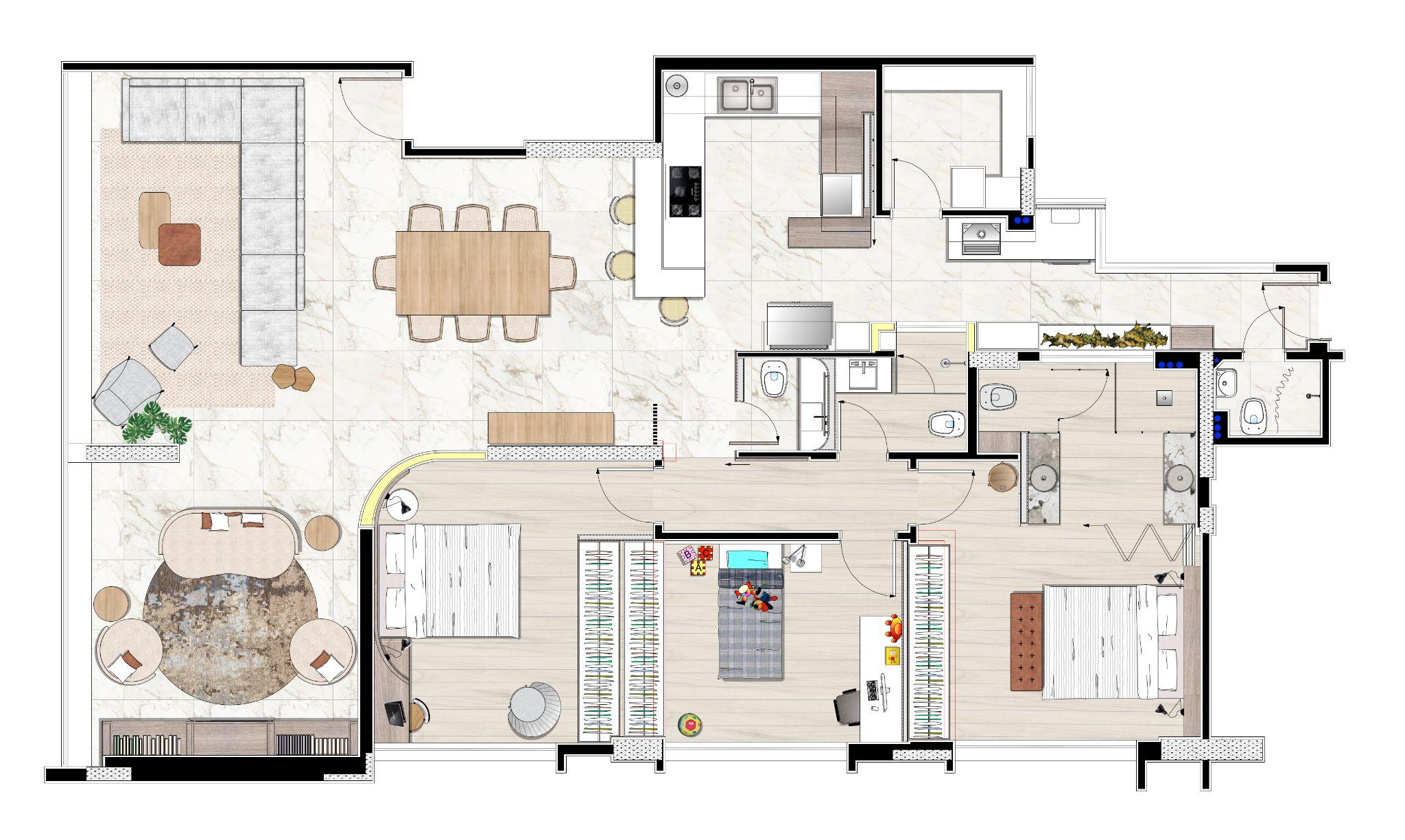 Mặt bằng tổng thể cho thấy bố cục không gian mở ở khu sinh hoạt chung và sự kết nối liền mạch giữa khách - ăn - bếp. Các phòng ngủ được tổ chức gọn gàng, tối ưu lưu trữ và bố trí theo lối tiếp cận trực quan, phản ánh đúng triết lý thiết kế của căn hộ