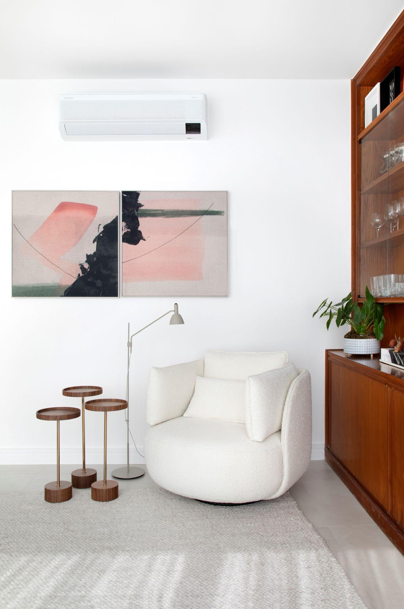 Chiếc ghế đơn dáng tròn đặt gần kệ tủ gỗ và tranh trừu tượng tông hồng - đen. Nội thất mềm mại được bố trí cạnh các đường nét vuông vức của tủ và tường nhằm tạo nhịp điệu thị giác hài hòa trong phòng