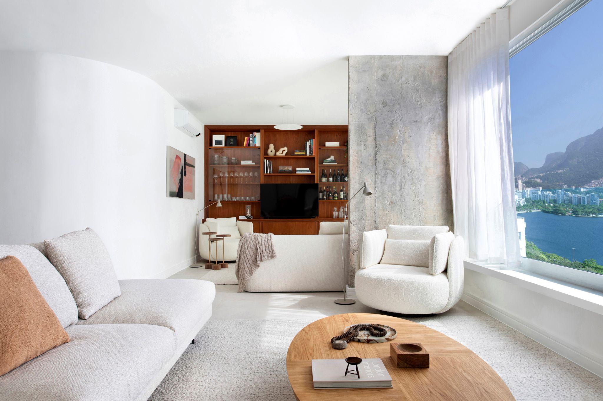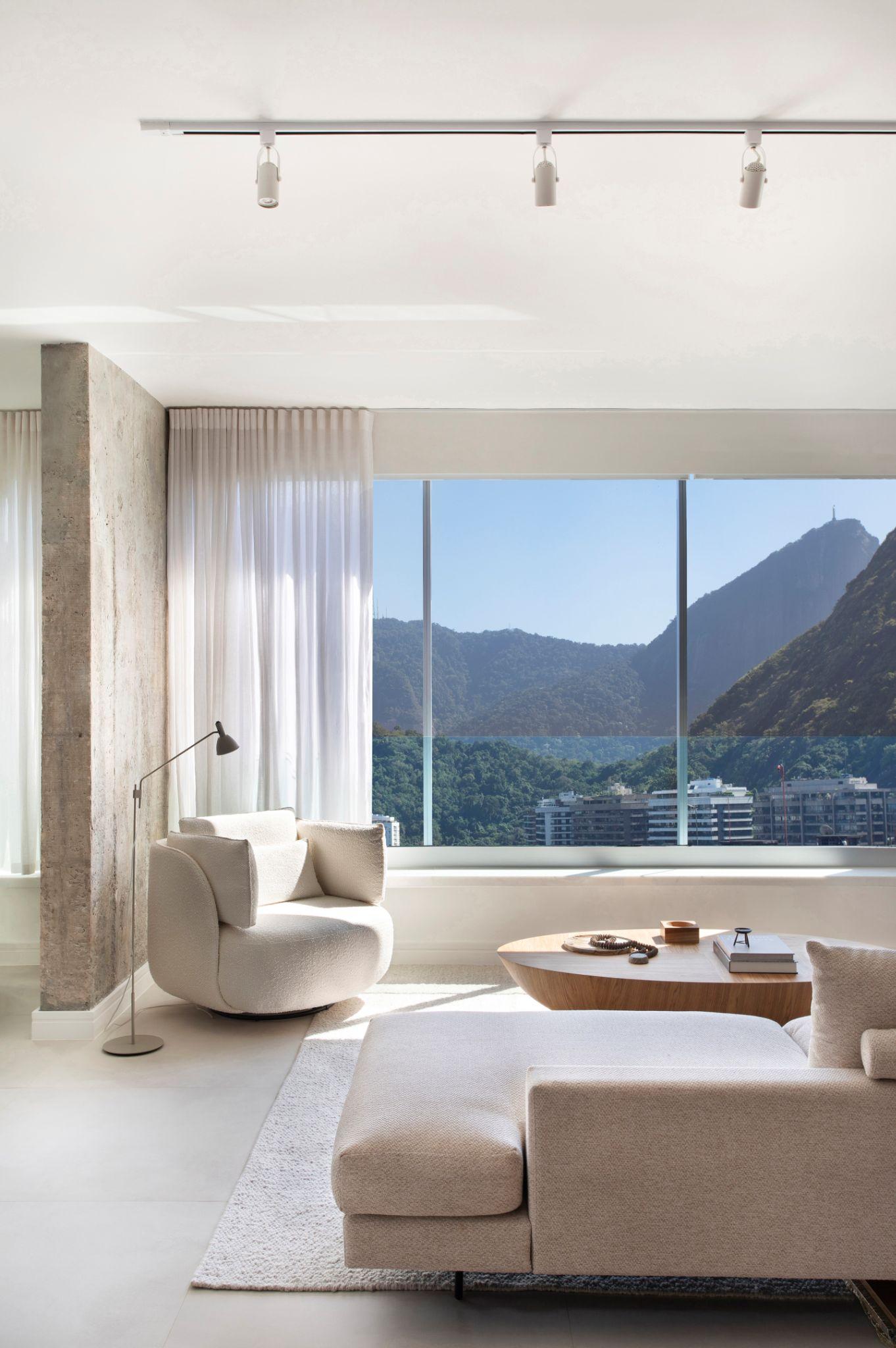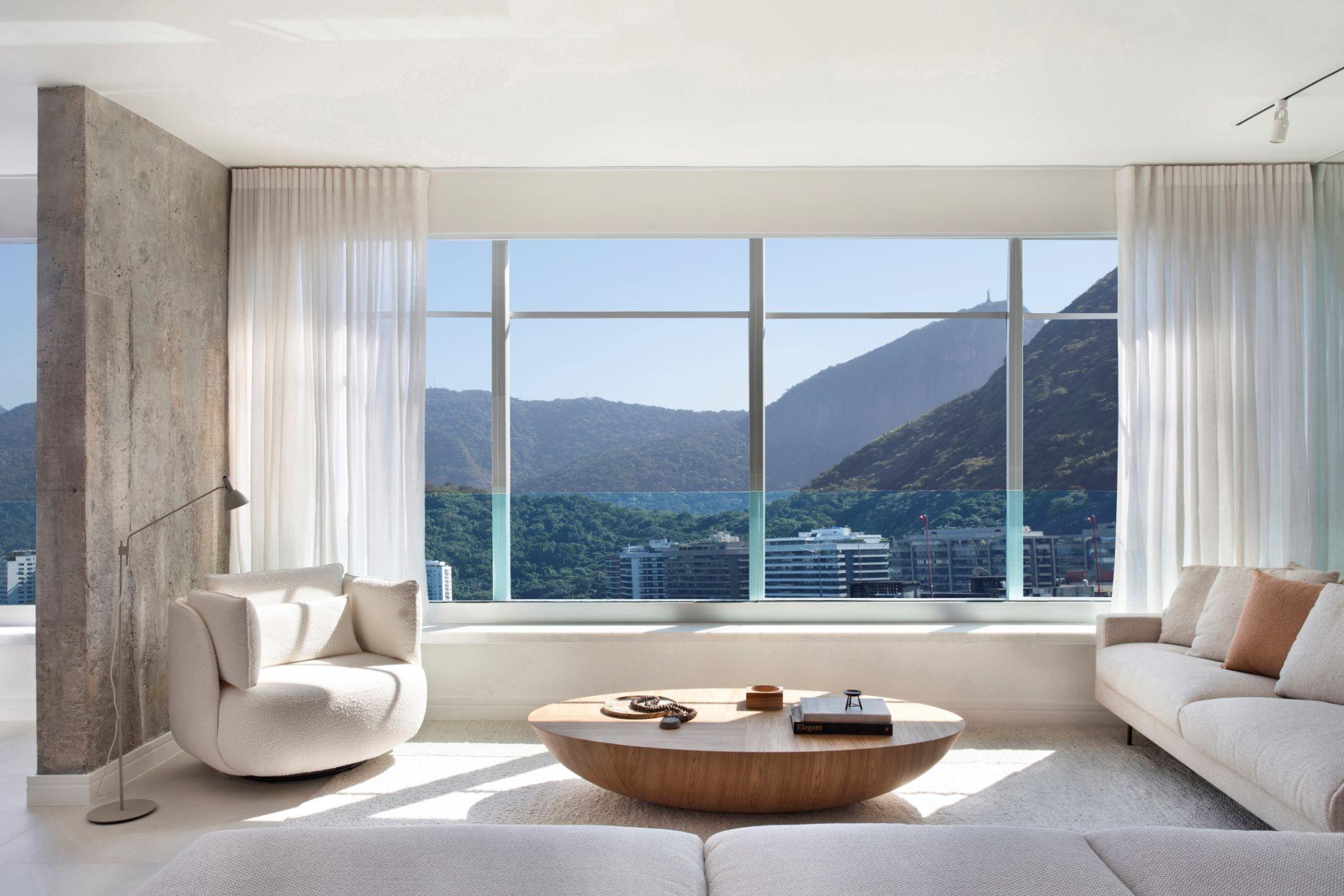 Không gian phòng khách sáng thoáng với sofa màu trung tính đối diện mảng kính lớn, mở trọn tầm nhìn ra hồ Rodrigo de Freitas và núi xanh phía xa. Thiết kế sử dụng nội thất thấp, màu sáng kết hợp rèm sheer để đón ánh sáng tự nhiên và nhấn mạnh cảnh quan ngoại thất