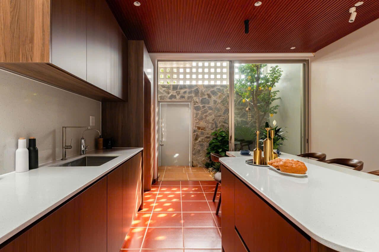 Gian bếp bàn ăn tạo cảm giác thân quen dù mới về ở, gợi hình ảnh "chái bếp hiên sau" đã đi sâu vào tiềm thức người con của đất Miền Tây.