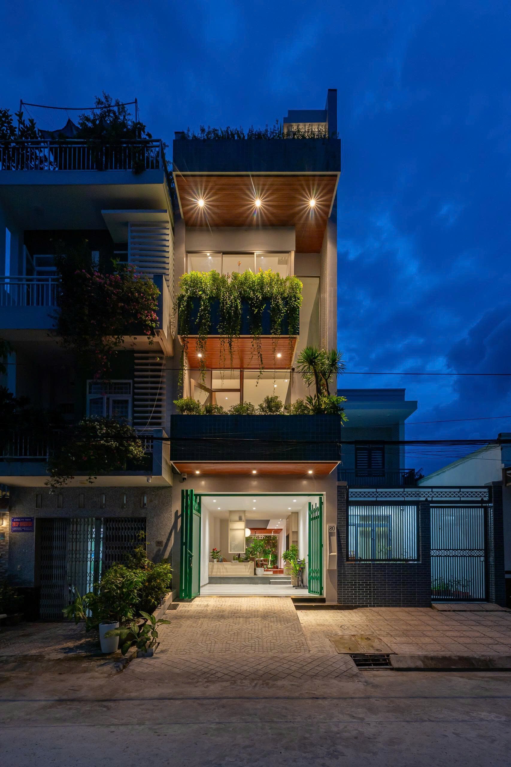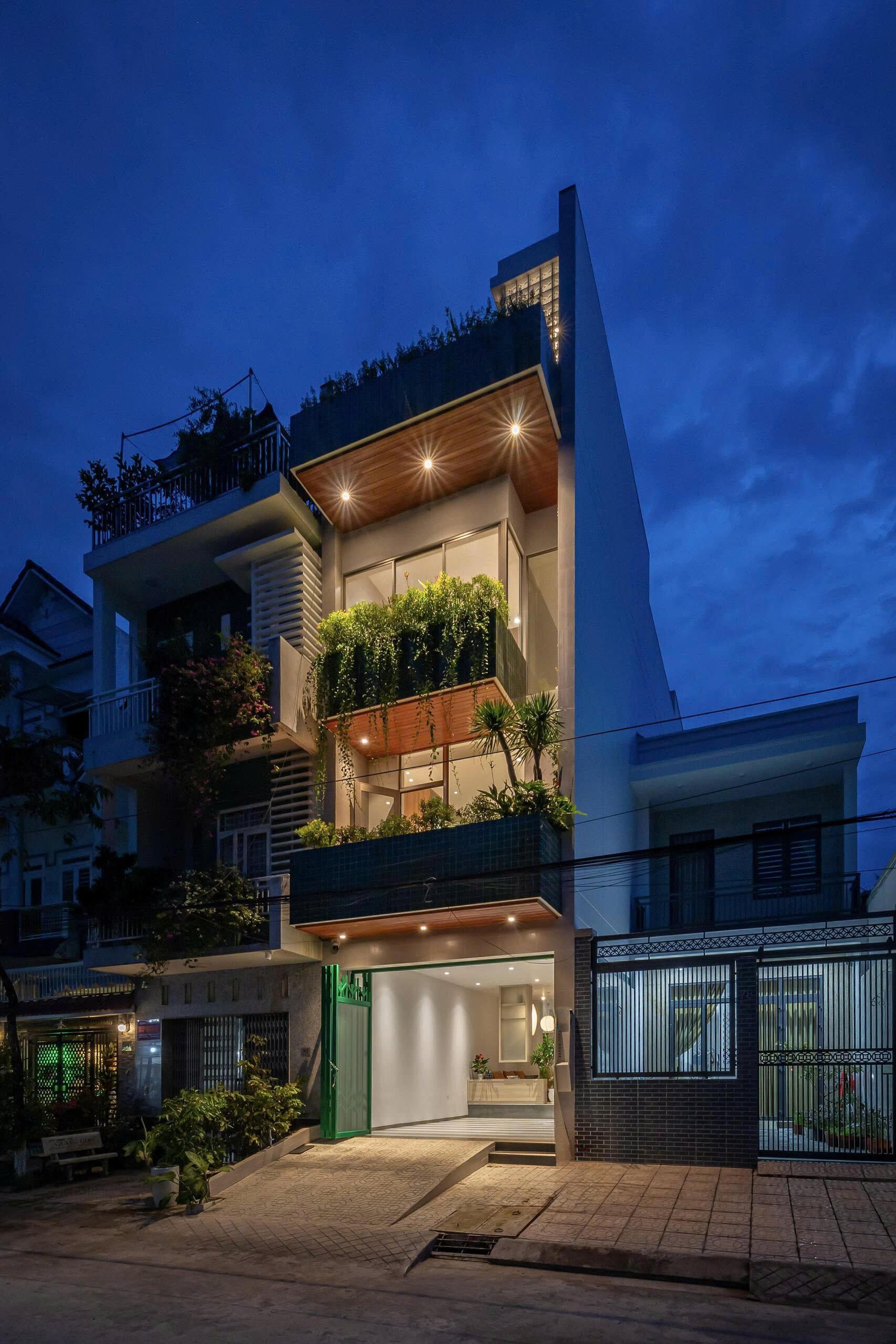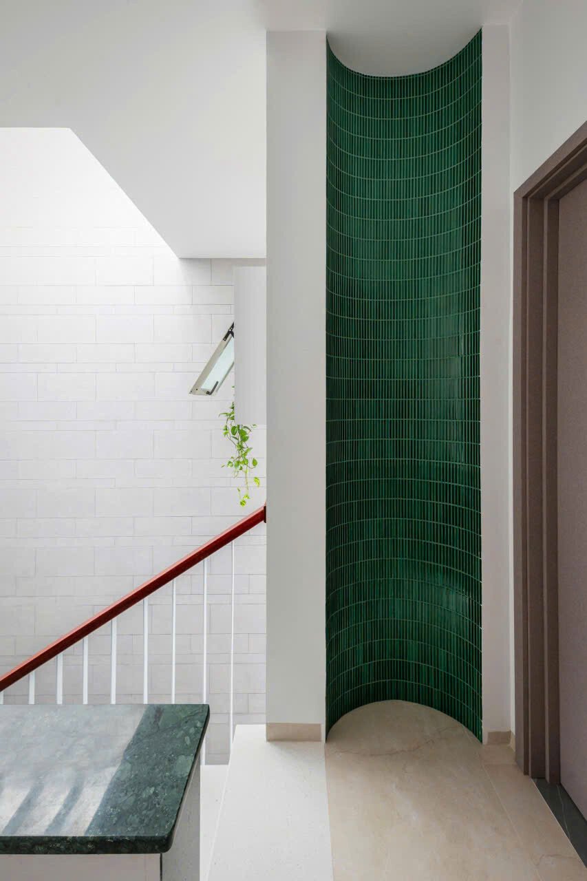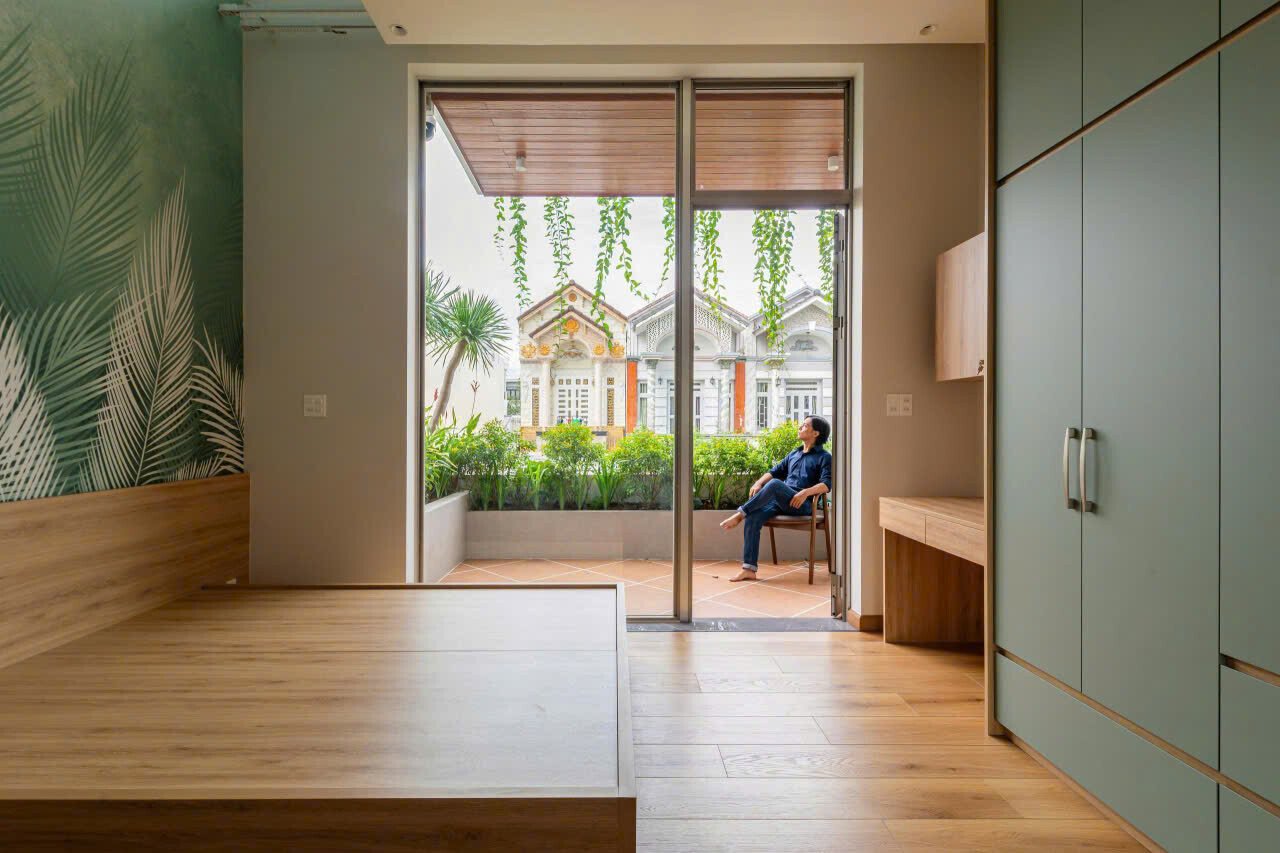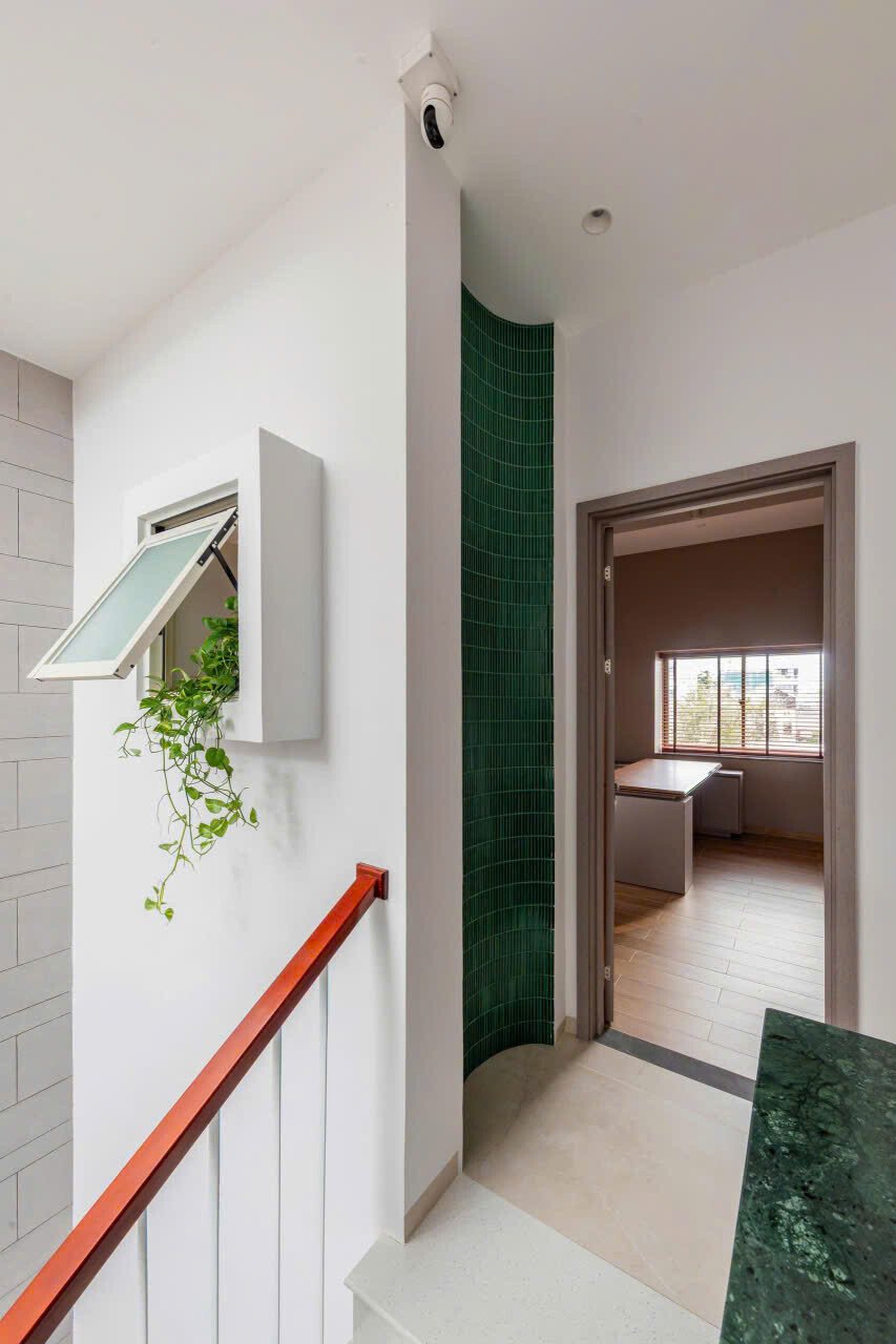 Qua những cuộc trò chuyện với gia chủ, kiến trúc sư chọn cách thiết kế mặt tiền ngôi nhà với sự đơn giản, khiêm nhường hòa nhập cùng những công trình hiện hữu trên khu phố, kết hợp khoảng lùi cùng các lớp cây xanh khéo léo giữ cho gia đình sự kín đáu riêng, mà vẫn thoáng đãng với những ô kính lớn trên cao.