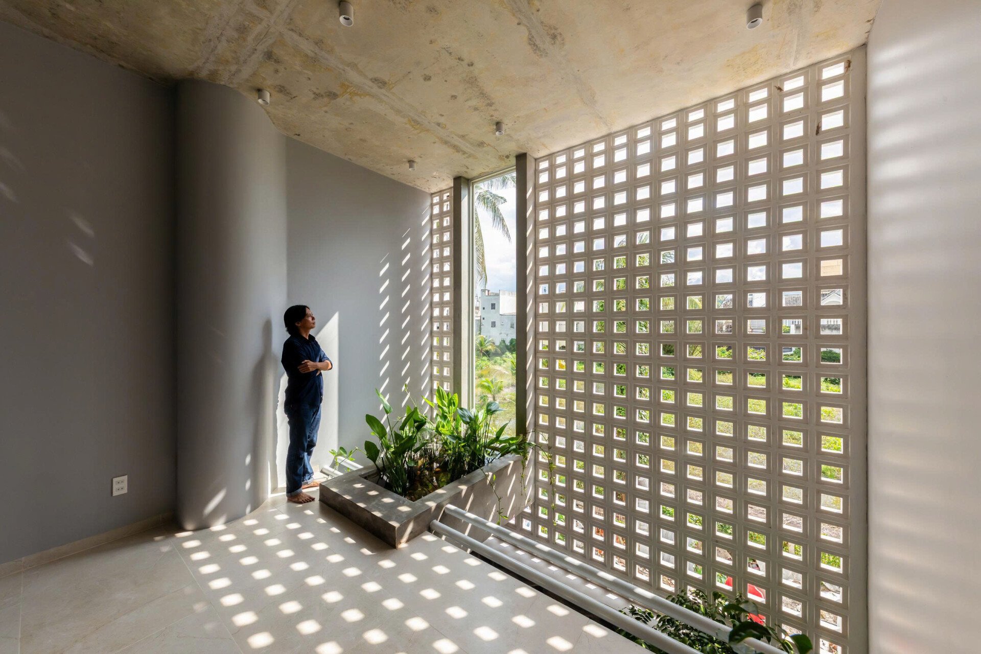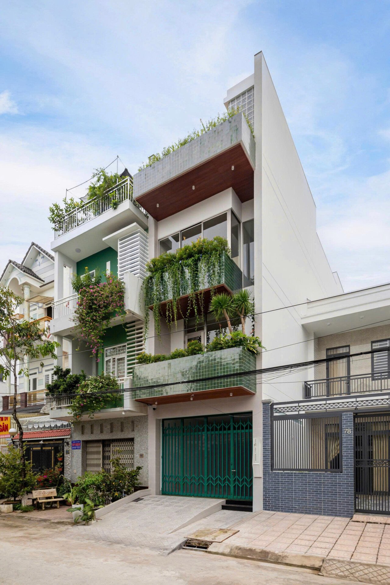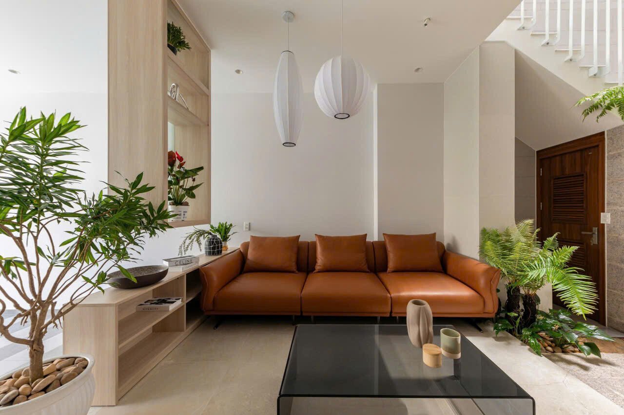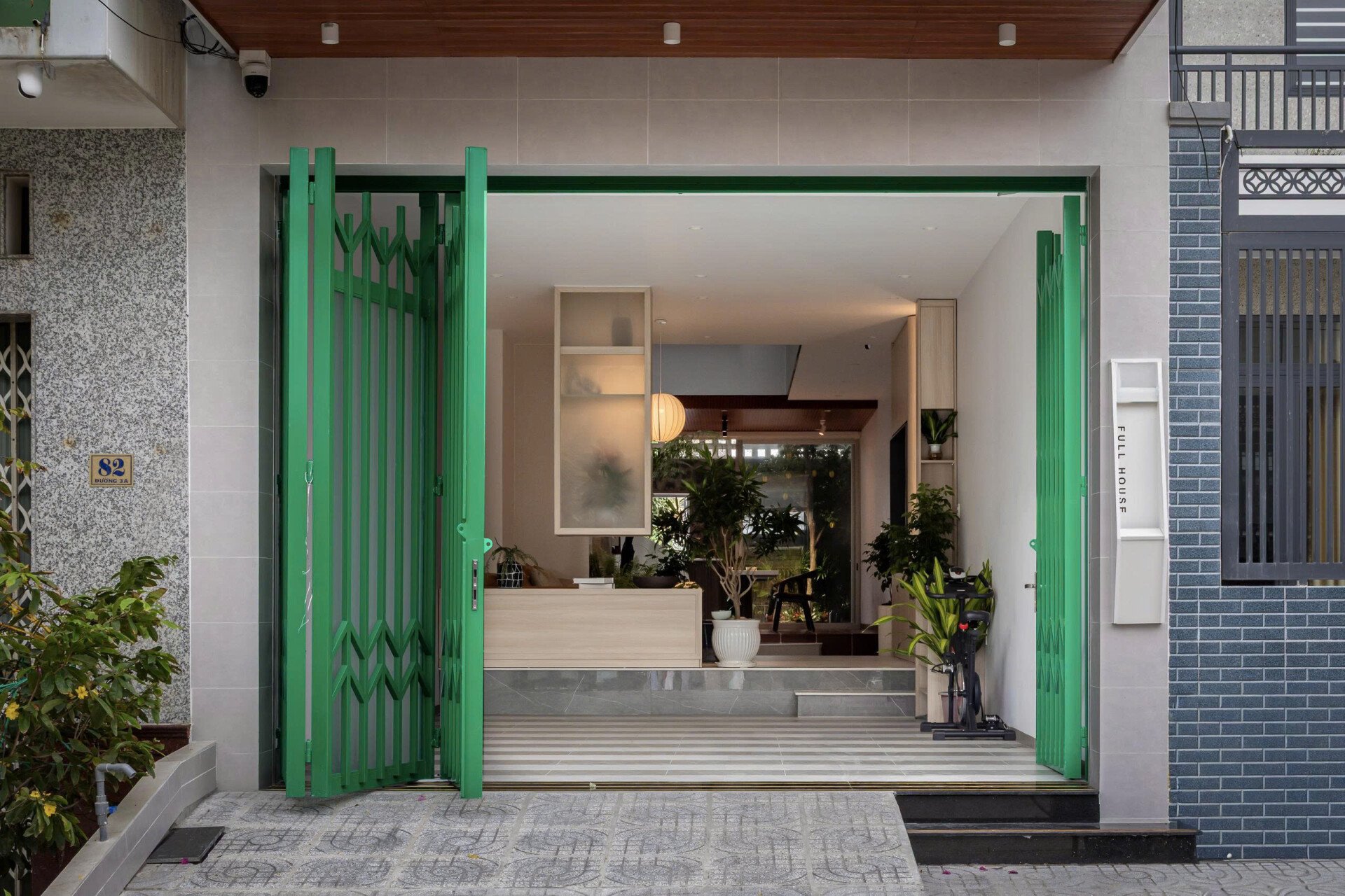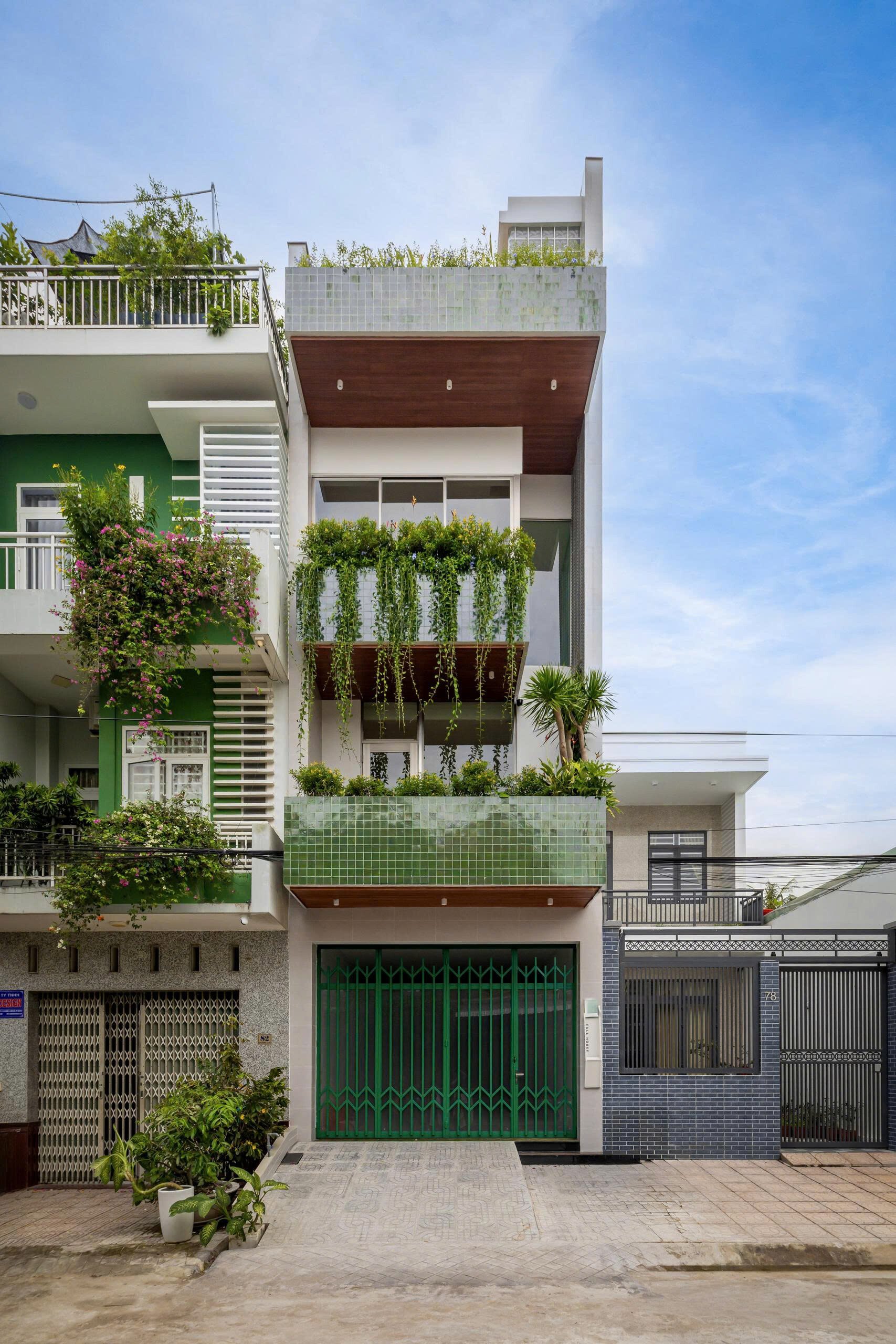 Qua những cuộc trò chuyện với gia chủ, kiến trúc sư chọn cách thiết kế mặt tiền ngôi nhà với sự đơn giản, khiêm nhường hòa nhập cùng những công trình hiện hữu trên khu phố, kết hợp khoảng lùi cùng các lớp cây xanh khéo léo giữ cho gia đình sự kín đáu riêng, mà vẫn thoáng đãng với những ô kính lớn trên cao.