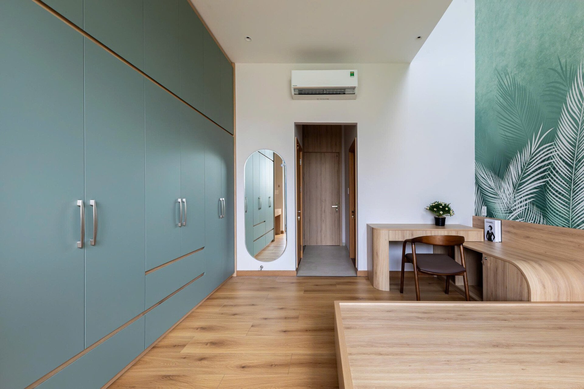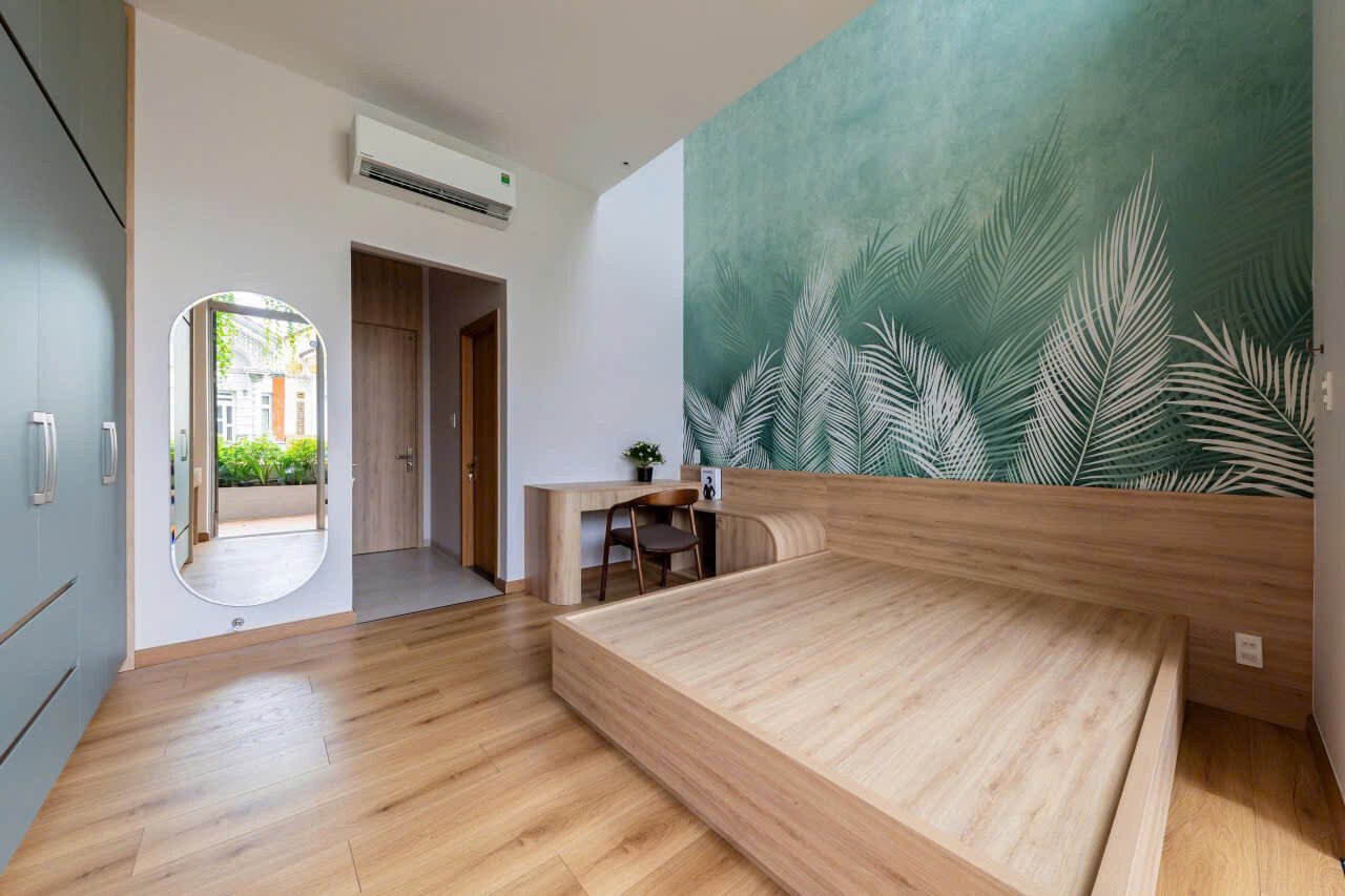 Phòng ngủ chính với hệ tủ áo lớn và bàn phụ đáp ứng nhu cầu của gia chủ. Ban công kết hợp lô gia tạo khoảng lùi giữ sự yên tĩnh riêng tư cho khu vực nghỉ ngơi. Lớp cây xanh vừa che chắn tầm nhìn, bụi và tiếng ồn từ bên ngoài, vừa tạo ra cảnh quan cho gia chủ thích ngắm hoa. Đồng thời những ô cửa kính lớn mở rộng tầm nhìn lên cao giúp cho tinh thần càng thêm thư thái. Có thể không cần lắp đặt bộ màn cửa.