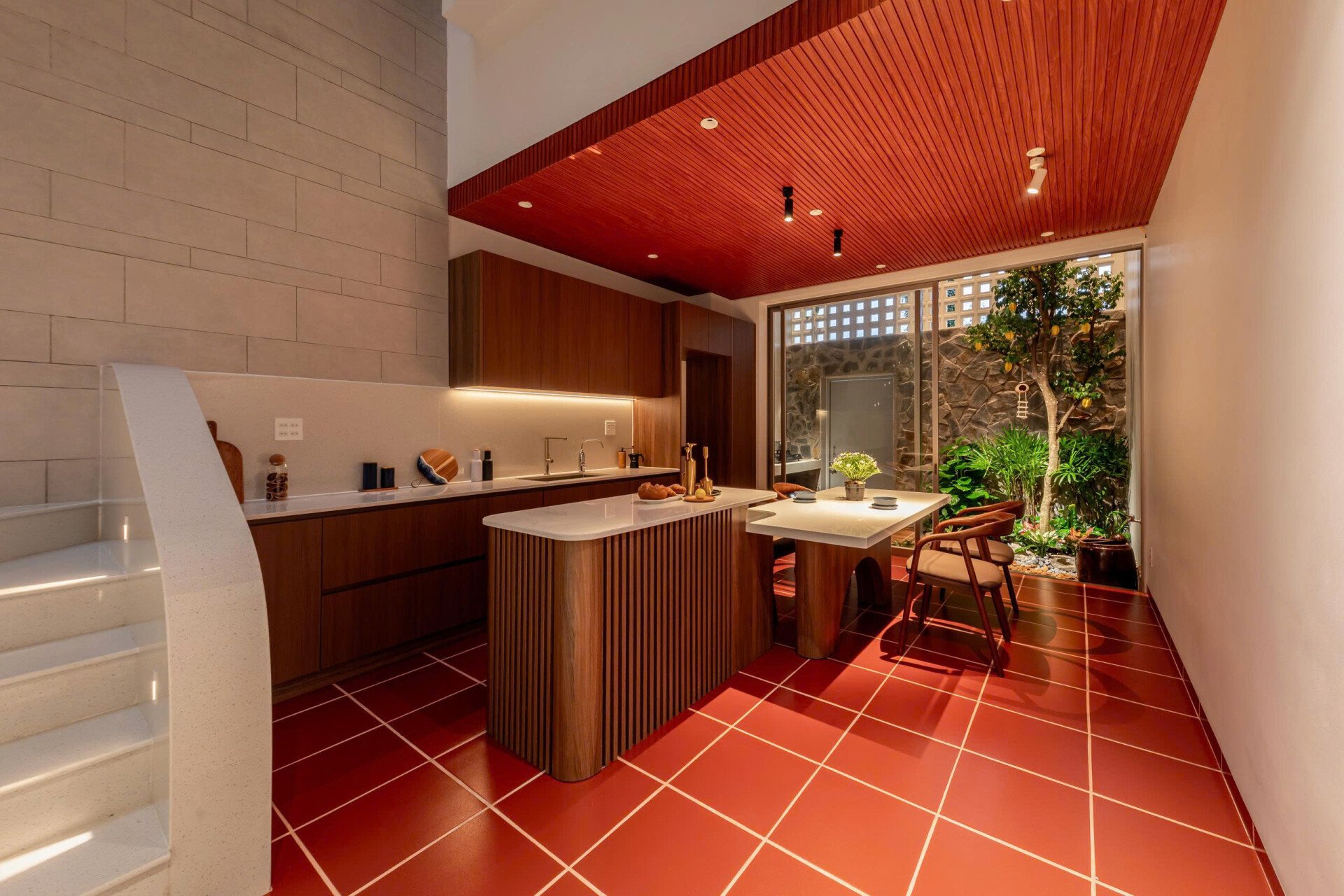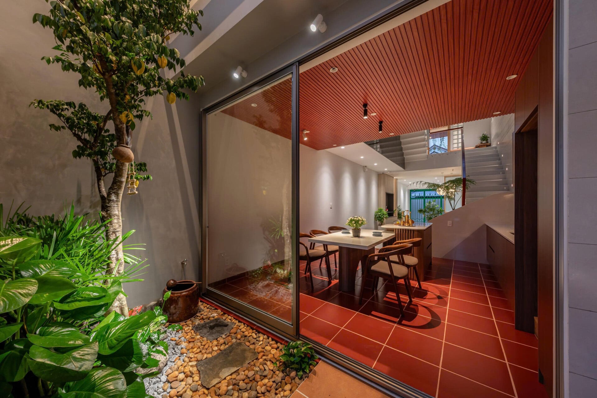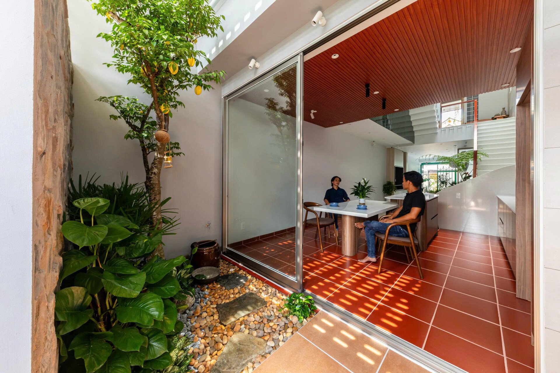 Bàn ăn cơm ấm cúng dưới mái hiên có tầm nhìn thoáng đãng với các khoảng mở thoáng sáng lên cao, cho phép vạt nắng xuyên kẽ lá vào nhà vừa đủ. "Cây cao trước ngõ, cây khế sau hè" vừa gần gũi vừa thanh cao sung túc.