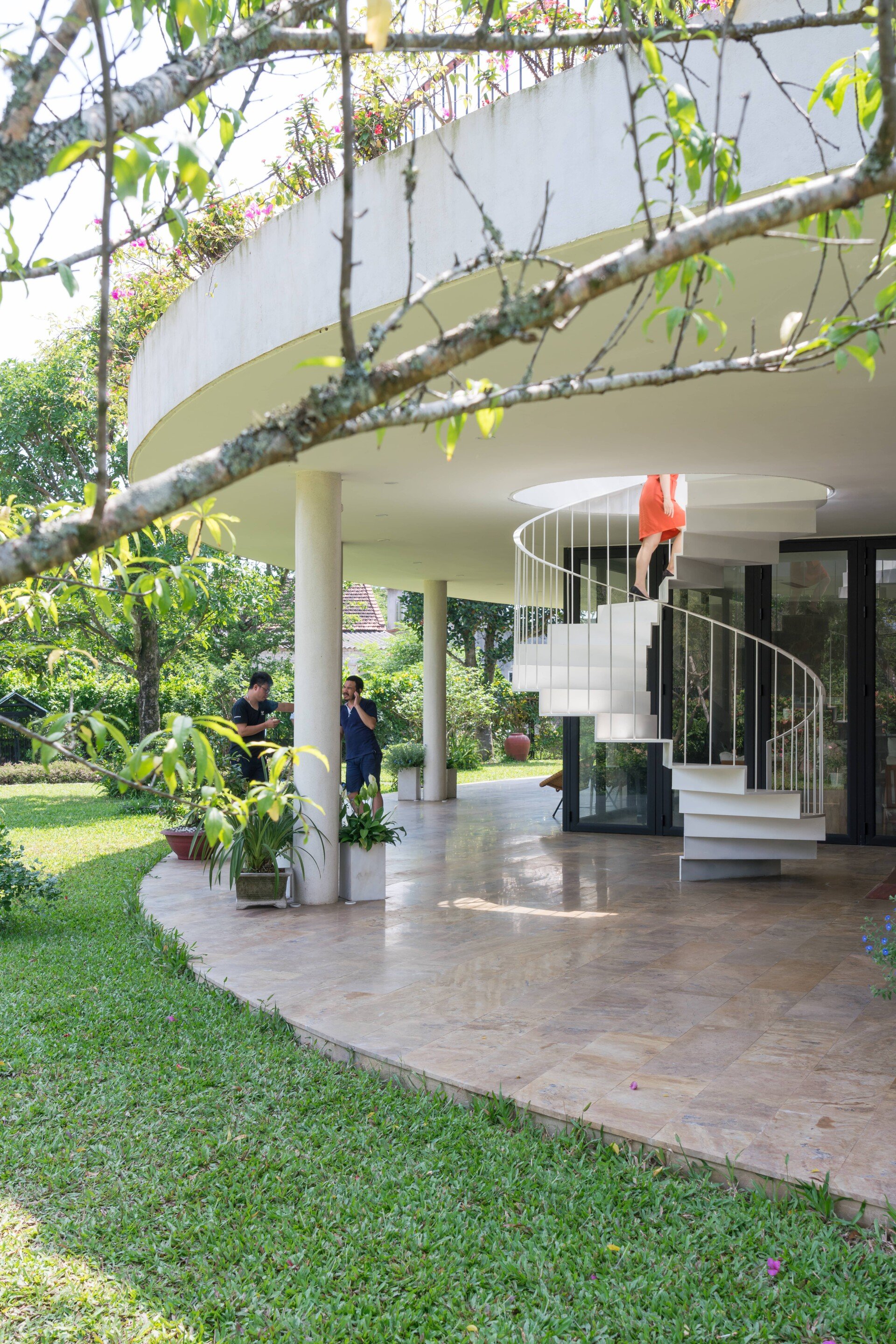 Hai khối còn lại tách rời khỏi khối elip của ngôi nhà là gara hình chữ nhật ở phía trước và bể bơi trị liệu hình tam giác ở phía sau. Sự tách rời mang đến không gian riêng cho phần khối chính ngôi nhà, tránh tiếng ồn xe cộ và không ảnh hưởng đến sự thư giãn ở bể bơi.
