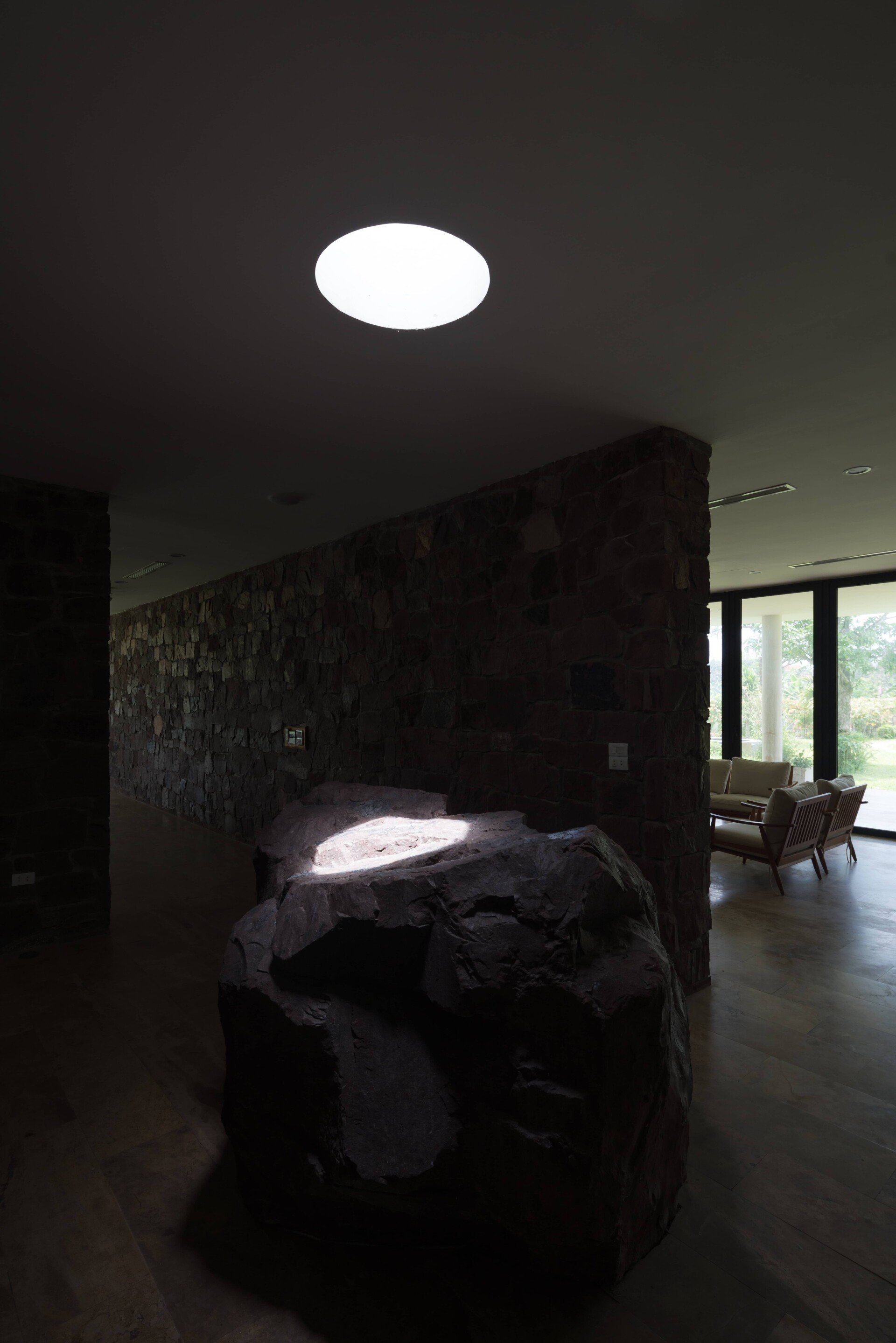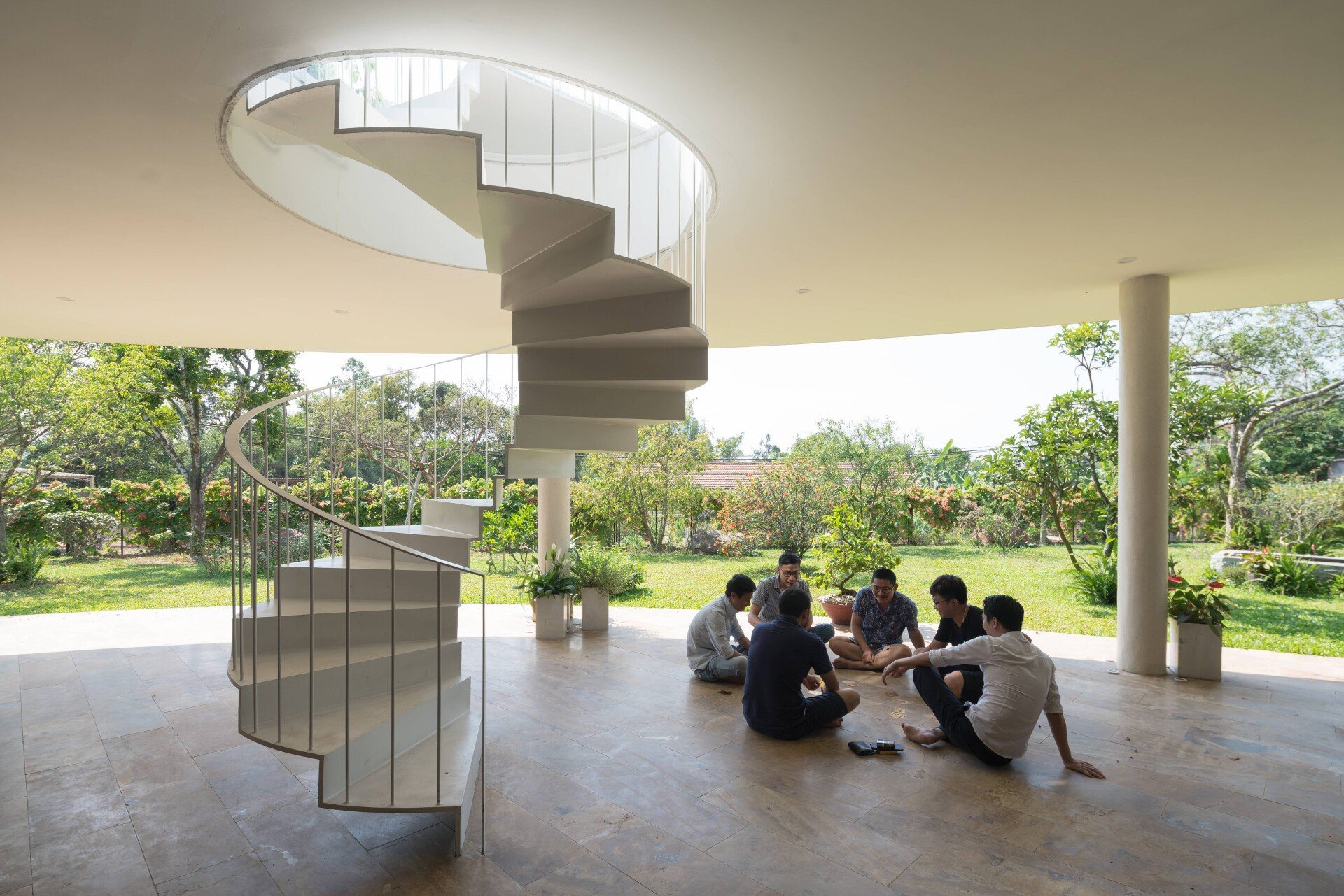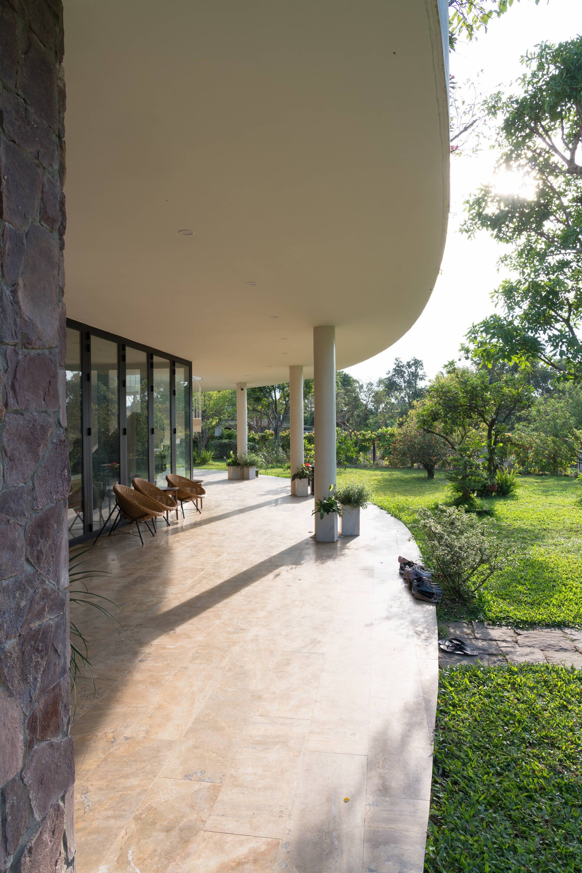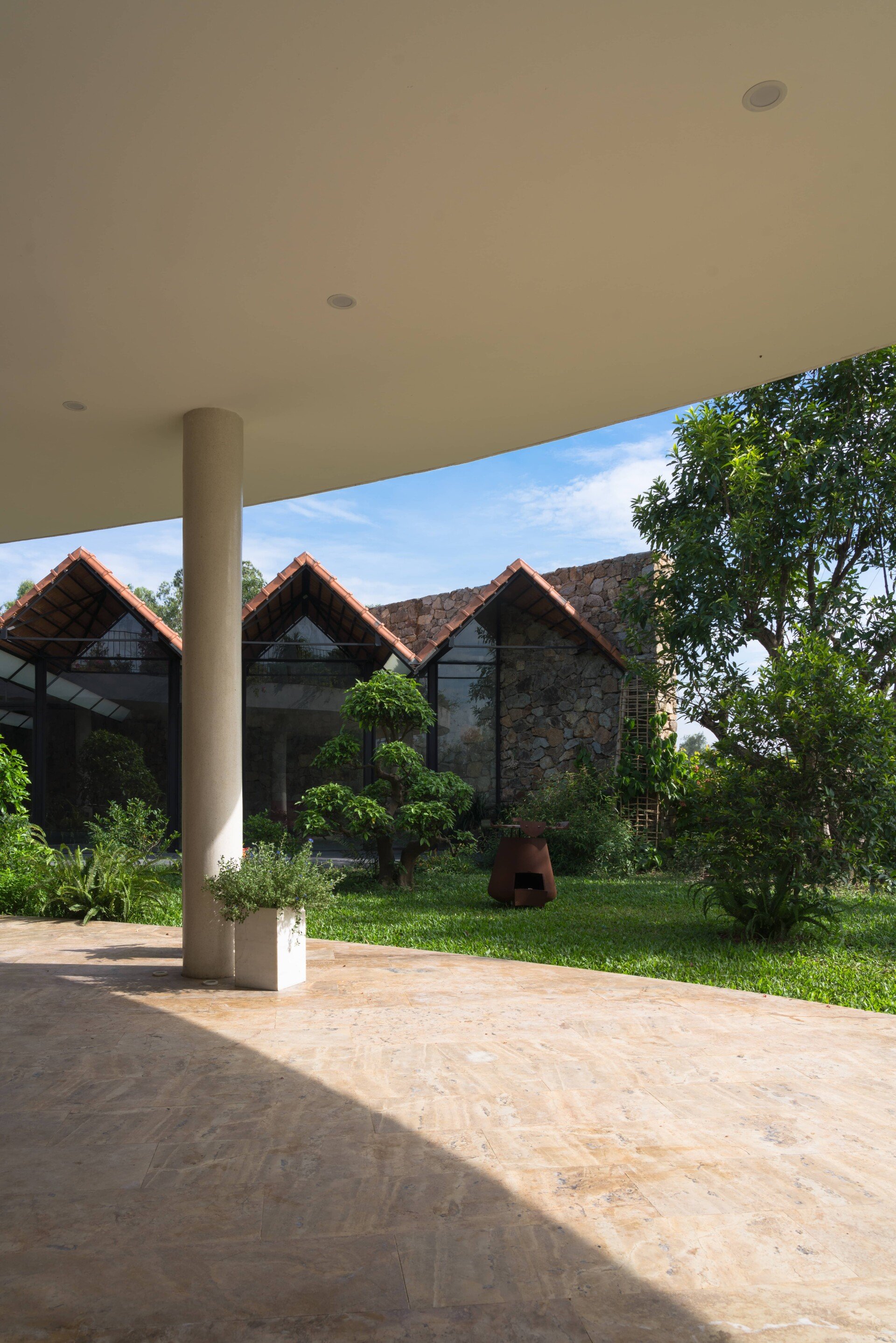 Khối chính là một hình elip lớn như vòm trời tròn trịa bao trùm toàn bộ, dưới ánh sáng tự nhiên cả khối nhà đổ bóng như một chiếc đồng hồ mang ý niệm thời gian. Chống đỡ khối thời gian ấy là bốn bức tường đá vững chãi tượng trưng cho bốn trục đông, tây, nam, bắc phân chia ngôi nhà thành những không gian riêng – chung. Trong đó nổi bật là hàng mái hiên được thiết kế bao xung quanh khối elip mang âm hưởng những mái hiên nhà Việt xưa cũ. Đây là không gian chuyển tiếp phần riêng tư bên trong con người đến với thiên nhiên rộng lớn bên ngoài và cũng là nơi diễn ra mọi hoạt động chính của căn nhà. Ở giữa tâm của ngôi nhà là một không gian đầy triết lý, được sắp đặt một khối đá lớn rắn rỏi như sự nhắc nhớ tình đoàn kết, gắn bó trong gia đình.