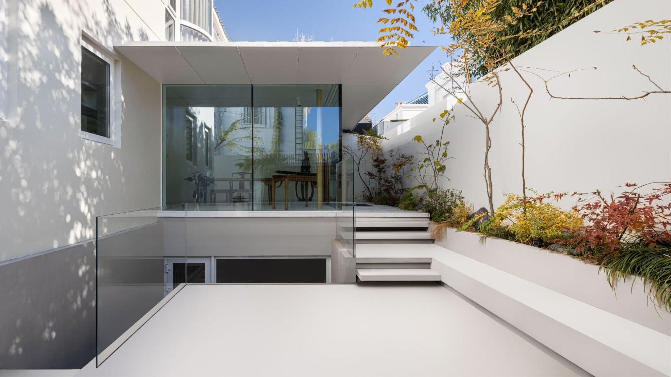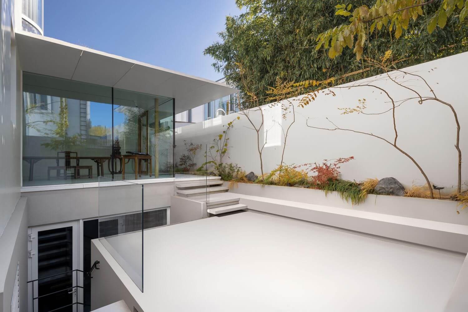 Thống nhất ngôn ngữ: Toàn bộ tường rào, bậc thang và nền sân được phủ tông màu trắng/xám sáng, làm nền cho cây xanh và ánh nắng nhảy múa, mang lại cảm giác tự do và khoáng đạt.