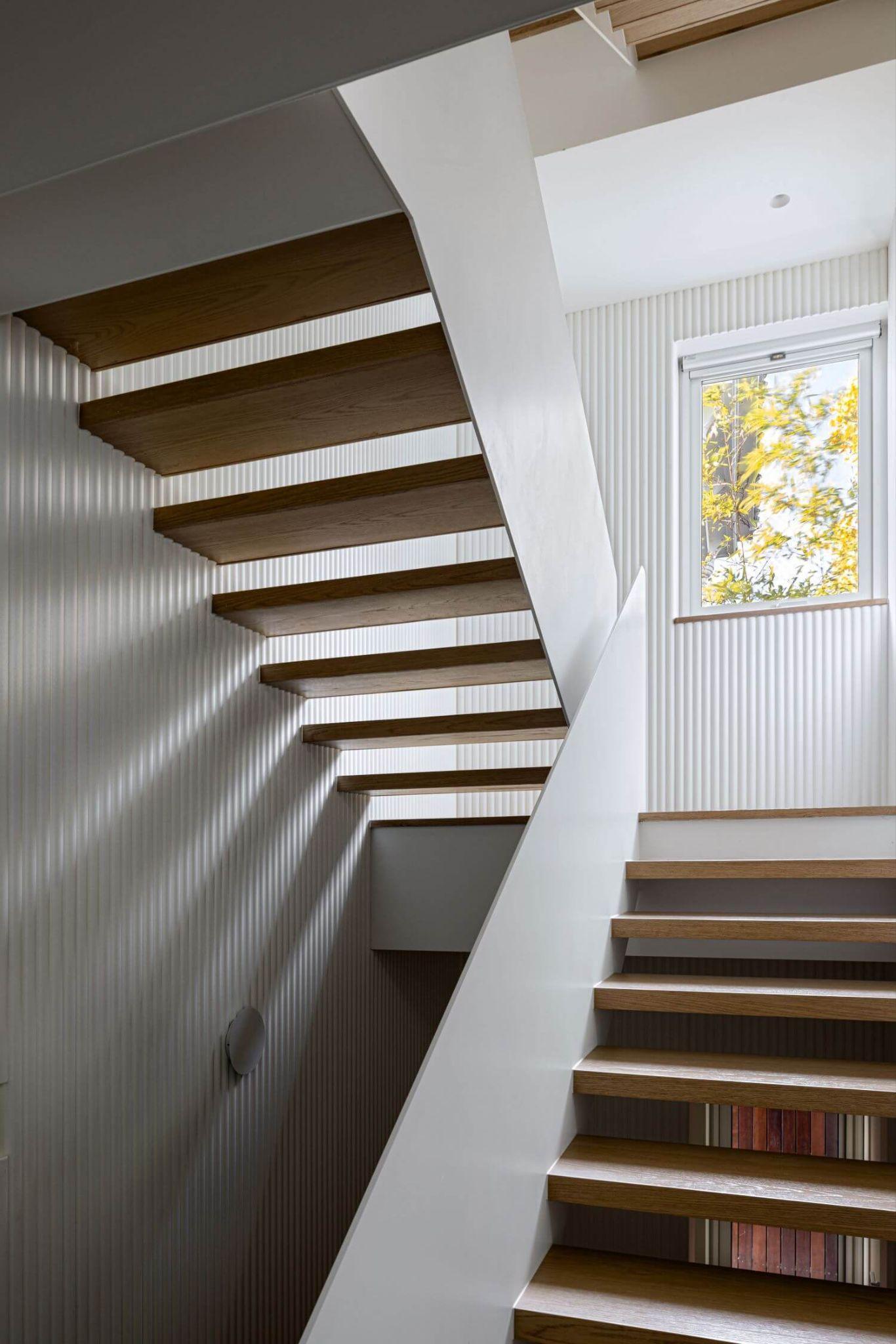 Hệ cầu thang gỗ tối giản được đặt trong không gian ngập tràn ánh sáng tán xạ từ giếng trời, tạo cảm giác nhẹ nhàng, hiện đại