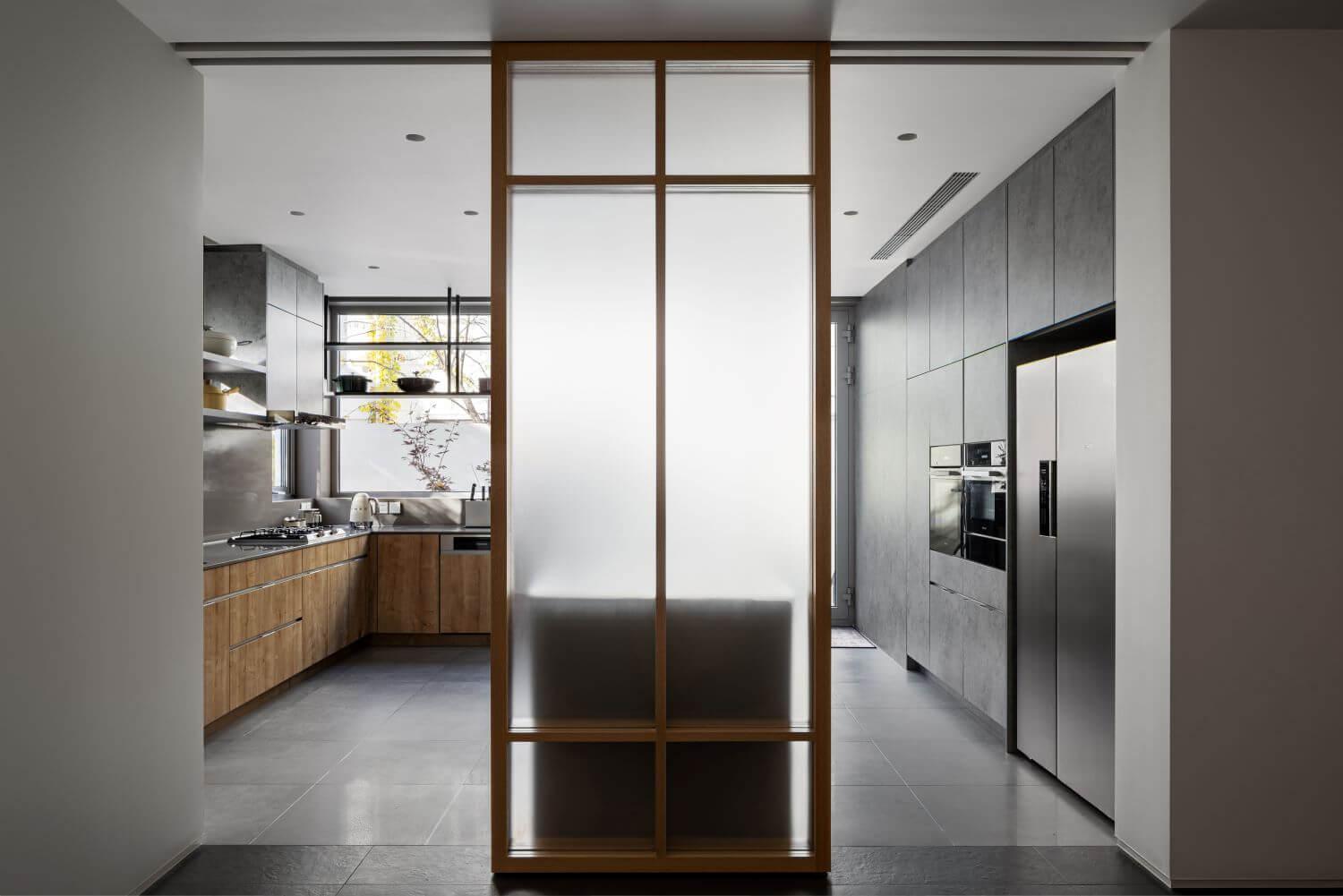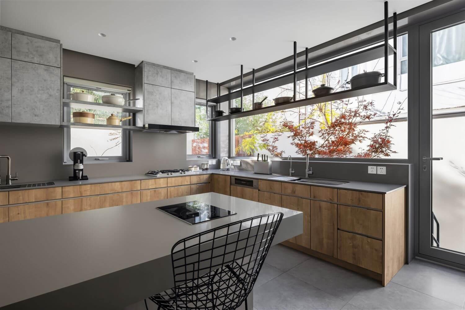 Khu vực bếp sử dụng tông trắng/xám và vật liệu tối giản tối đa hóa ánh sáng tự nhiên