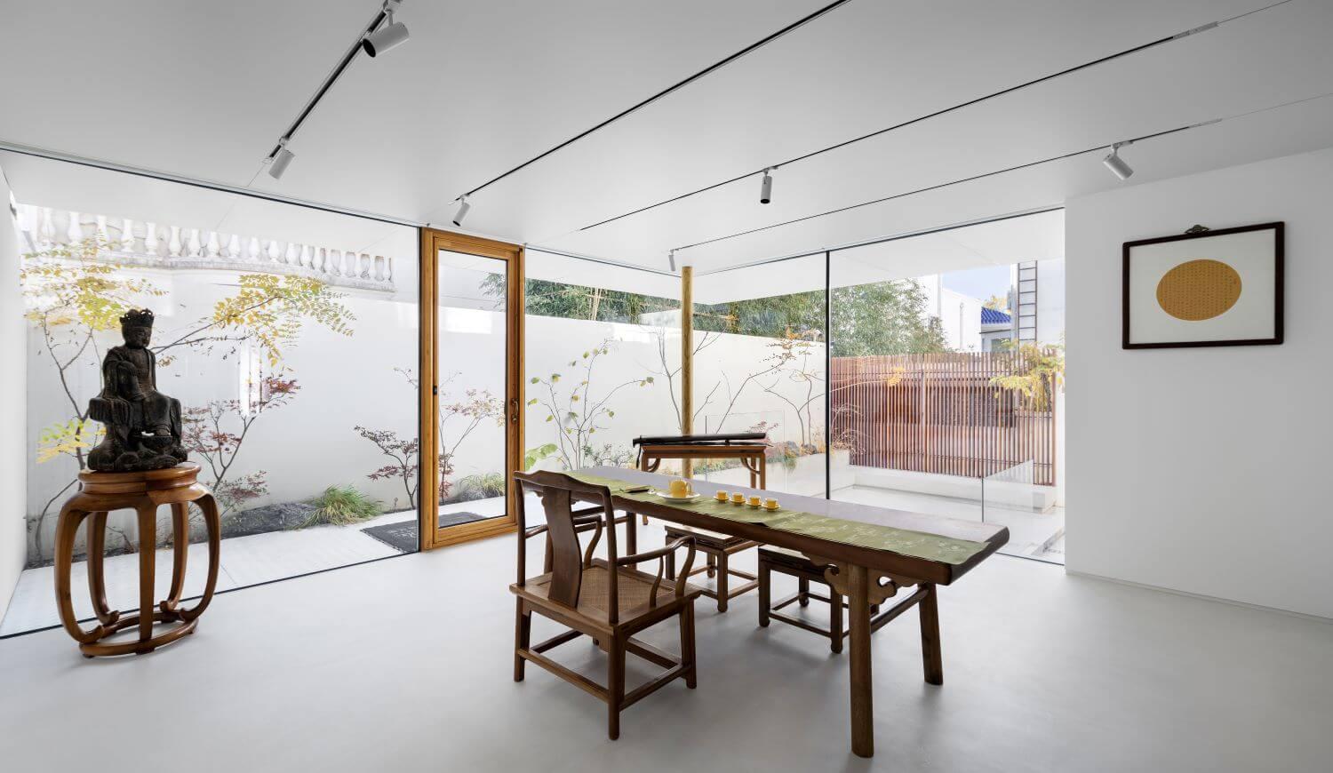 Sự kết hợp giữa kính, khung nhôm mảnh và sàn micro-cement mang lại vẻ đẹp hiện đại đầy sáng tạo. Tại đây, sự tĩnh lặng của trà đạo gặp gỡ sự biến đổi sinh động của thiên nhiên qua từng mùa, tạo nên những khoảnh khắc thiền định đắt giá.