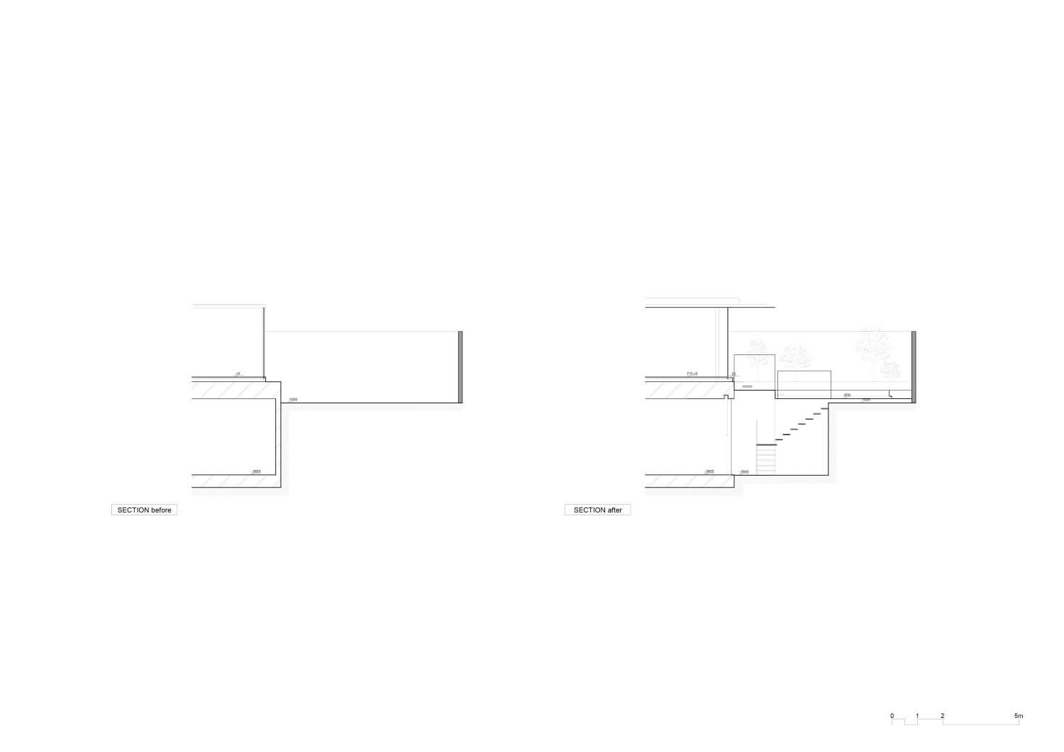Nhận thấy sảnh đón ban đầu quá thấp và tối, KTS đã quyết định dỡ bỏ hoàn toàn phòng vệ sinh ở tầng trên ngay vị trí này. Một khoảng thông tầng cao 5m được hình thành, đóng vai trò như một giếng trời nhân tạo. Ánh sáng từ tầng 2 tràn xuống, biến sảnh đón thành một patio rực rỡ.