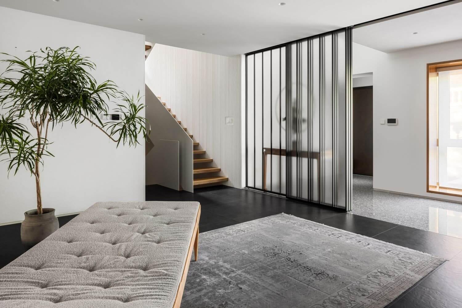 Khu vực sảnh đón với sàn đá mài Terrazzo, vách kính phân chia và khoảng thông tầng cao phía trên, tạo sự chuyển tiếp ánh sáng kịch tính