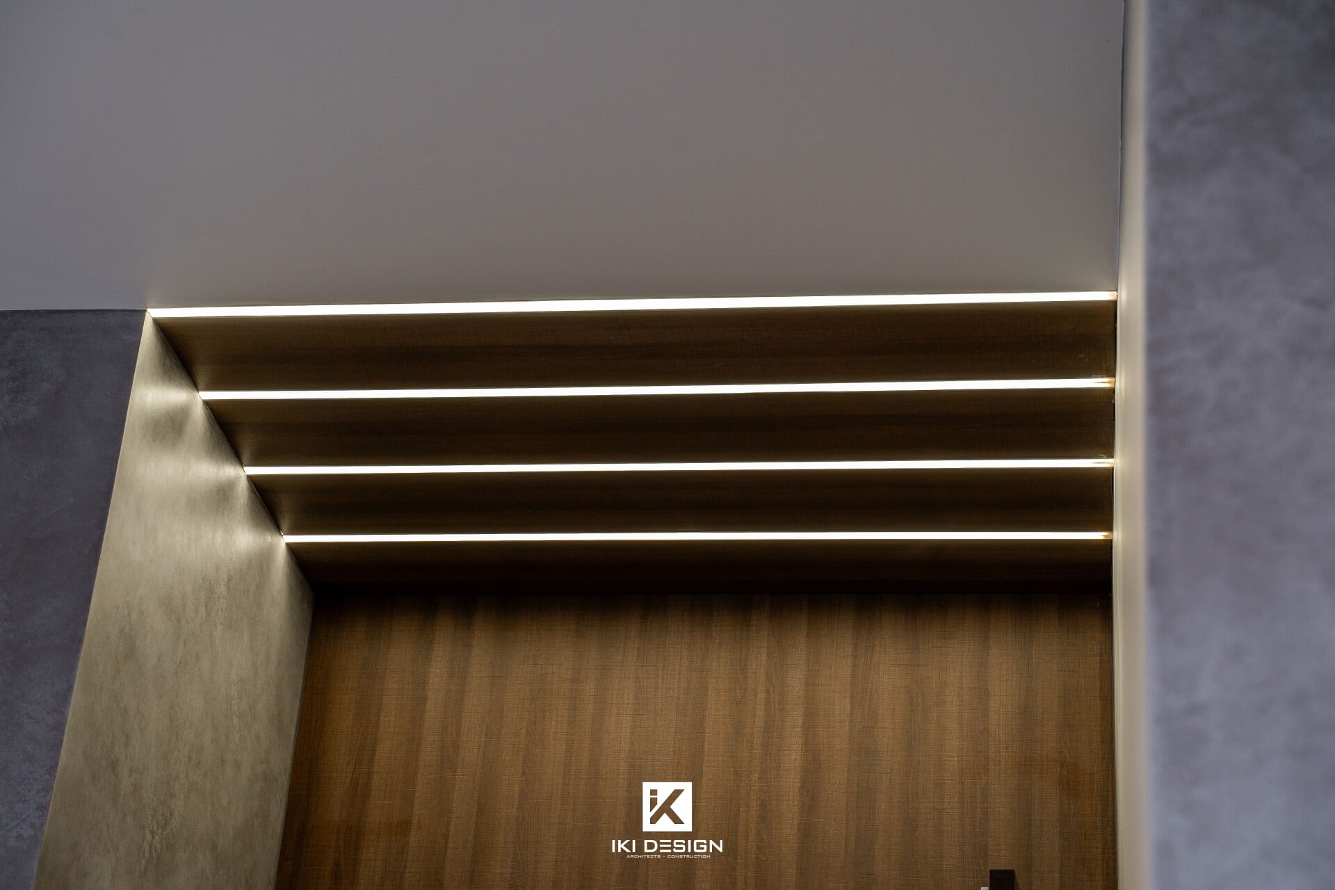 Hệ trần lam gỗ kết hợp dải đèn LED âm chạy song song tạo điểm nhấn thị giác cho khu vực hành lang. Ánh sáng hắt khe tinh tế giúp nhấn mạnh chiều sâu vật liệu và giữ cảm giác ấm áp cho không gian.