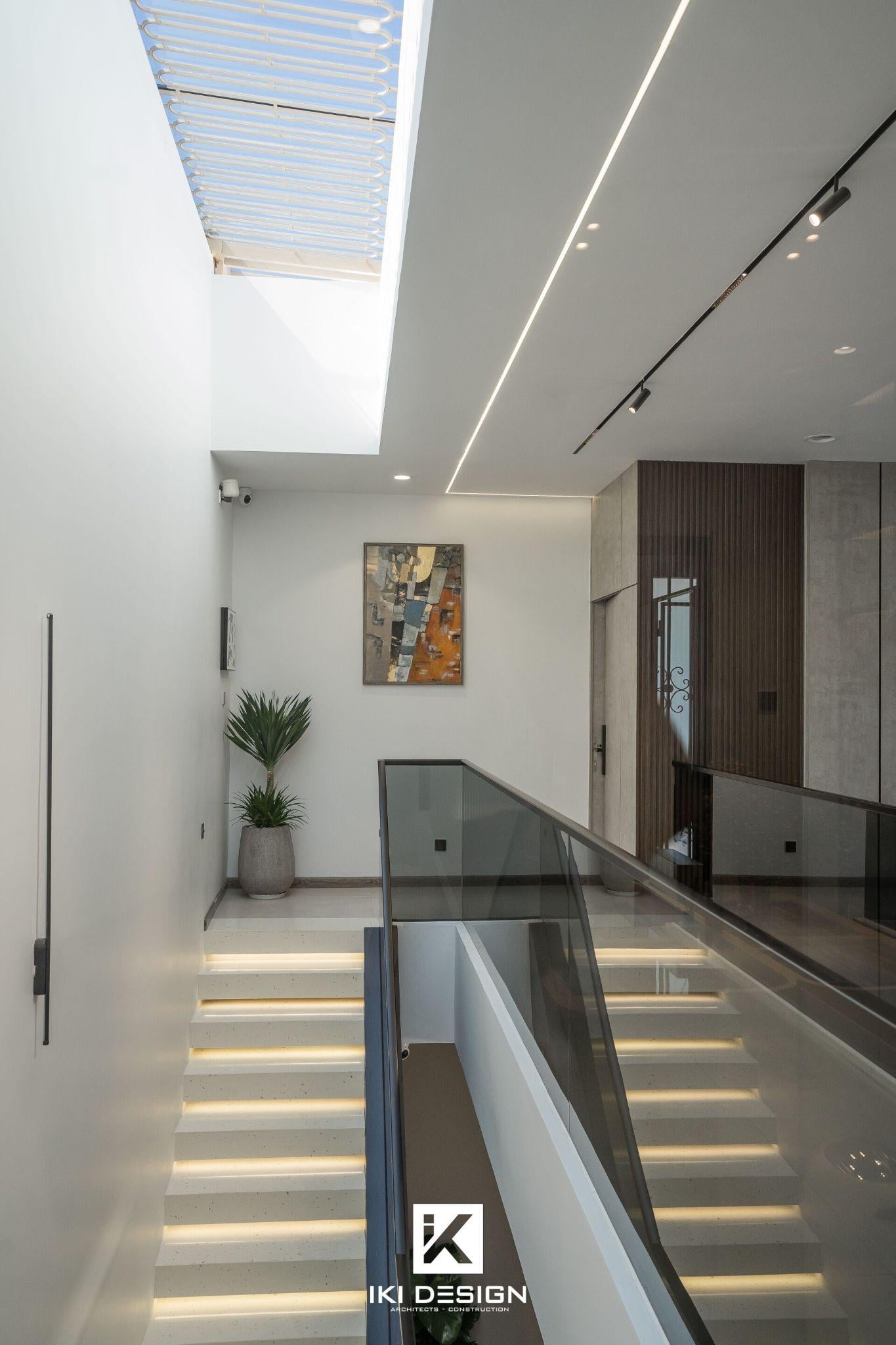 Không gian giao thông trong nhà được IKI Design xử lý bằng ánh sáng tự nhiên. Cầu thang rộng thoáng với lan can kính trong suốt, kết hợp đèn hắt khe dưới bậc và giếng trời trên mái, giúp khu vực này luôn sáng, thoáng và tràn năng lượng.