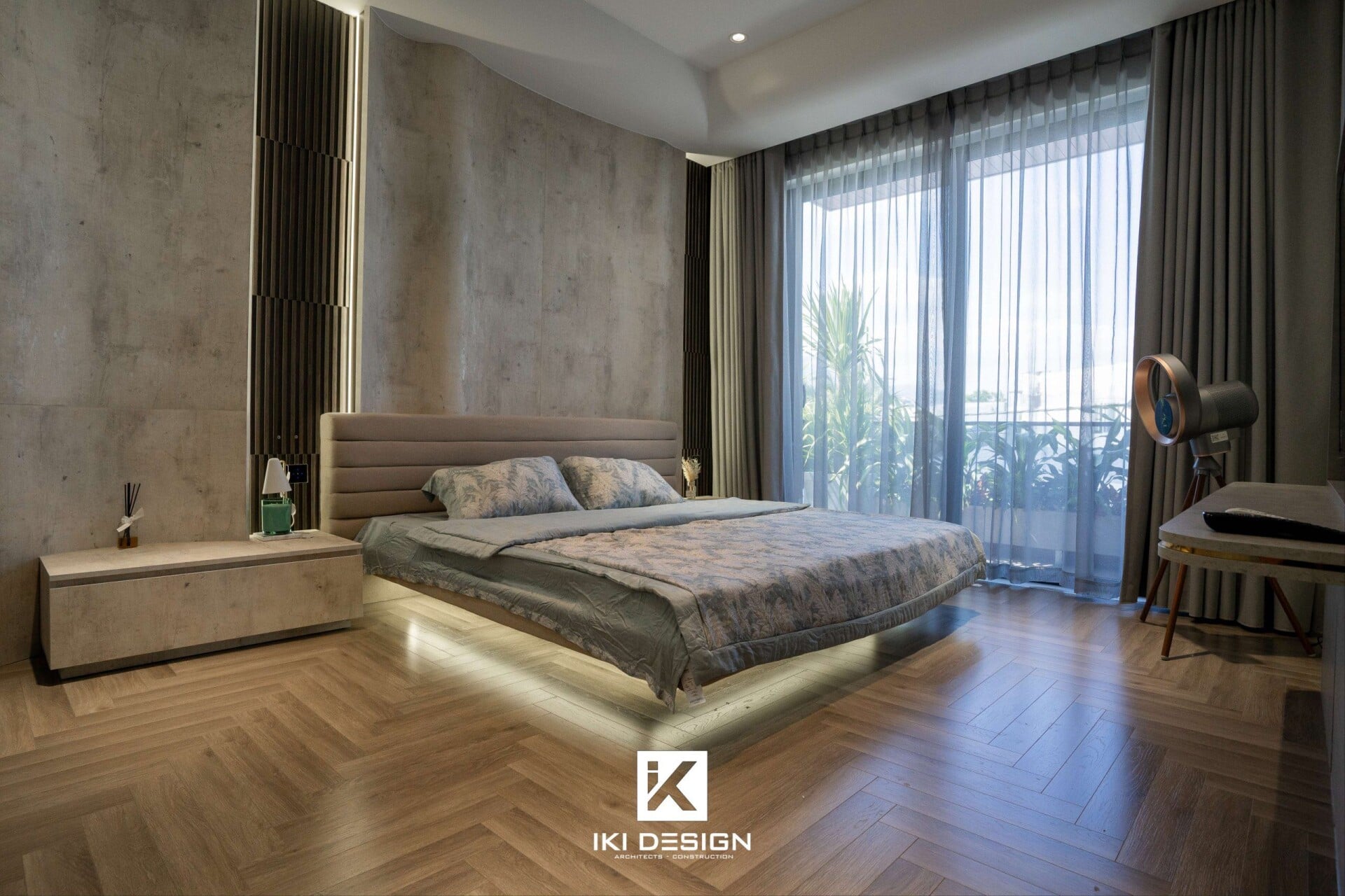 Không gian ngủ chính sử dụng tone màu trung tính, kết hợp giữa bê tông trần, vải nỉ và gỗ sồi sáng để tạo cảm giác ấm áp, yên tĩnh. Giường được thiết kế dạng “floating bed” (giường nổi), khéo léo giấu hệ đèn hắt bên dưới giúp chiếc giường như đang lơ lửng, đồng thời mang lại ánh sáng dịu nhẹ vào buổi tối. Cửa kính lớn mở ra ban công, nơi ánh sáng và cây xanh tràn vào mỗi sáng, khiến căn phòng luôn thoáng và nhiều năng lượng.